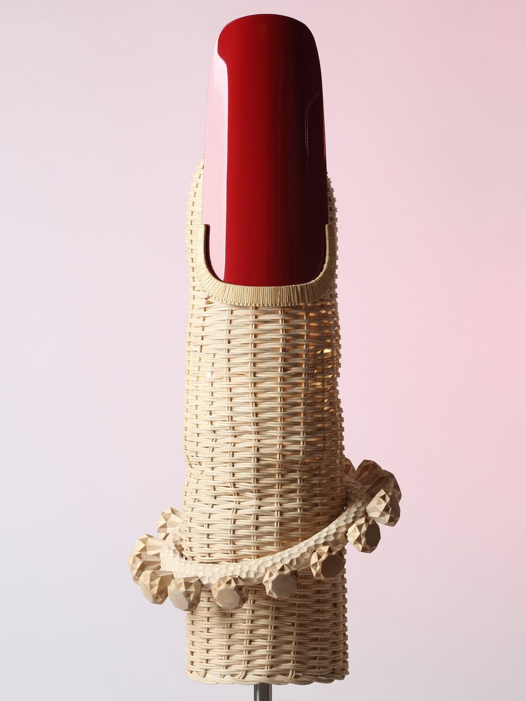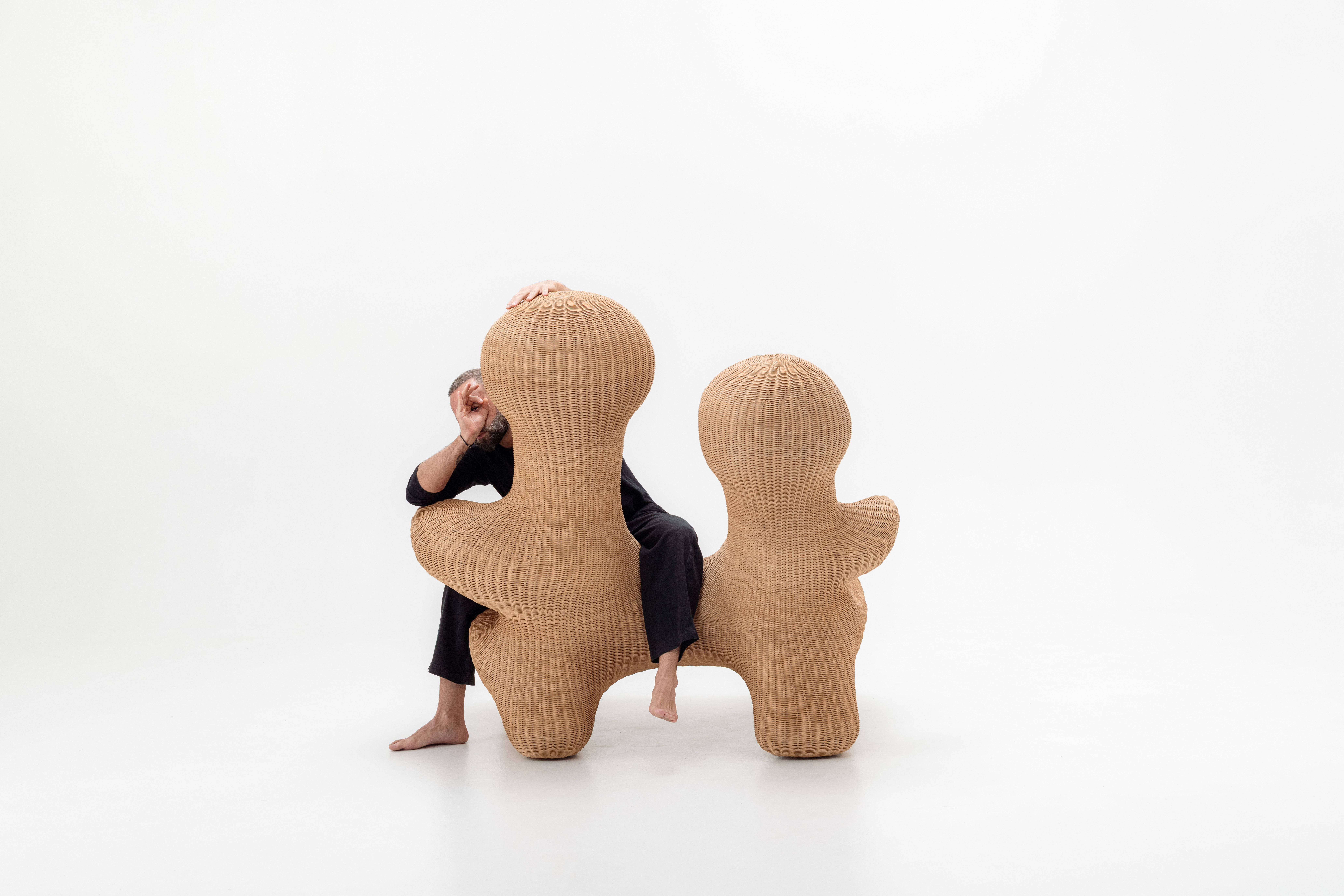 La Volupté: Unfolding arrived at Galleria Rossana Orlandi carrying four years of accumulated meaning. The collection made its international debut at SaloneSatellite in 2022, found its most powerful expression at Womb of a City during WeDesignBeirut, concluding with “The Cut,” a performative severing of the cord binding the collection’s forms together, and won the Créateurs Design Award for Best Collection in Paris earlier this year, selected by a peer jury of over 300 international design leaders from a shortlist that included Vincenzo De Cotiis. In Milan, five limited-edition pieces were presented: La Volupté (the chair), The Long Wait (the bench), The Conversation We Never Had (a conversational table where two forms incline toward one another, almost touching), Distilled Intimacy (the stool), and The Embrace (the love seater). All hand-sculpted in resin and natural rattan by master weavers in Lebanon, the works carry within them a wicker-weaving tradition that is now genuinely endangered, threatened not only by generational discontinuity but by the conditions of the country itself.