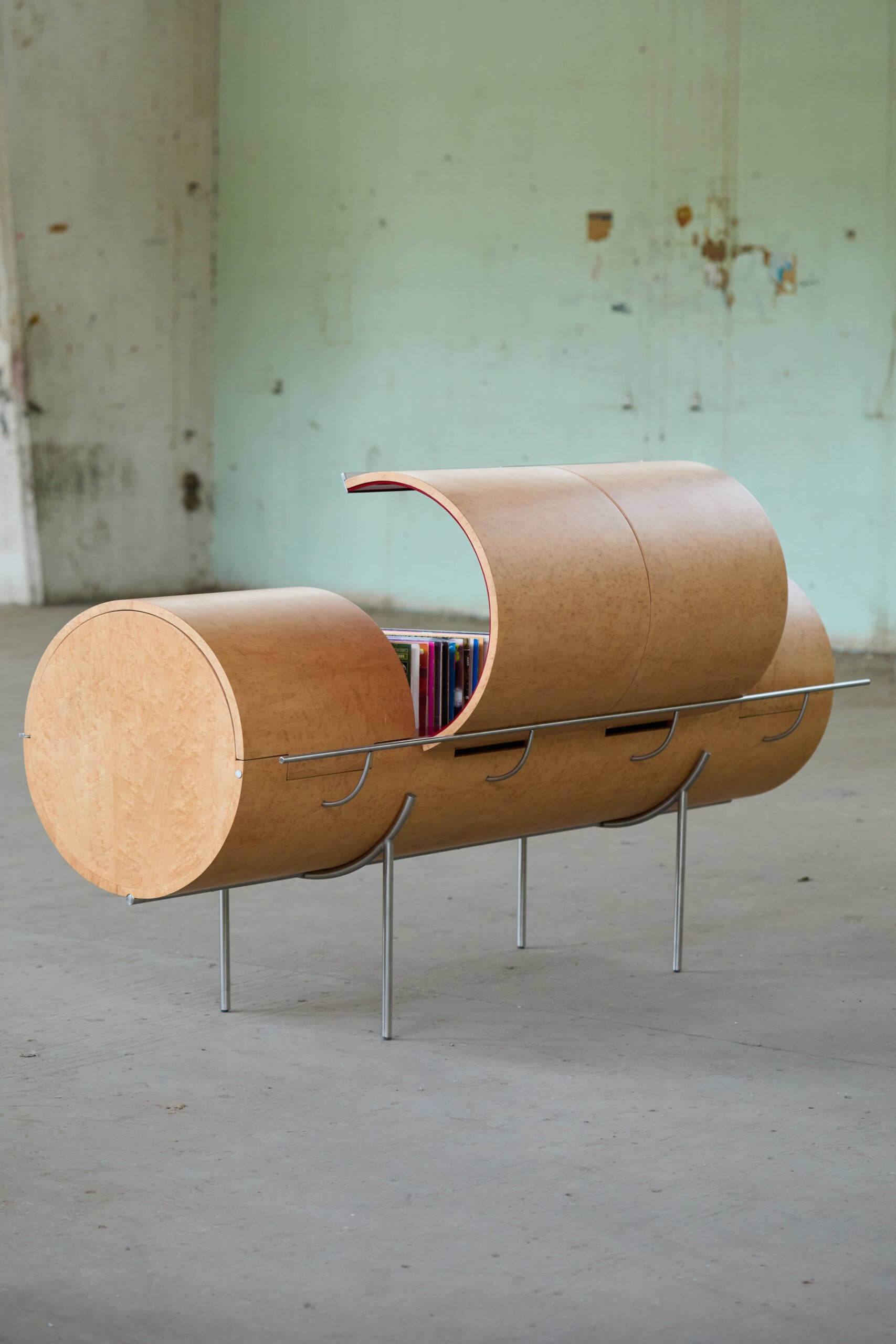 Credenza 01 was first presented at WeDesignBeirut before making its international premiere at Alcova Milano 2026. Built from bent birch veneer formed into a series of cylindrical volumes, each housing concealed storage and open shelving, and elevated on slender steel legs that give the whole structure an almost architectural lightness, the piece was made by Lebanese craftsmen in Beirut. The wood is warm, the steel is spare, and the tension between the two is precisely the point. As Marine Zovighian (UNTITLED.studio) and collaborator Serge El Douaihy (GRIDWORK) put it: “the Credenza offers a quiet insistence, something to gather around, something that stays.” That duality of resilience and restraint, of craft elevated by circumstance, is what makes this debut land with the force of something far larger than a single piece of furniture.