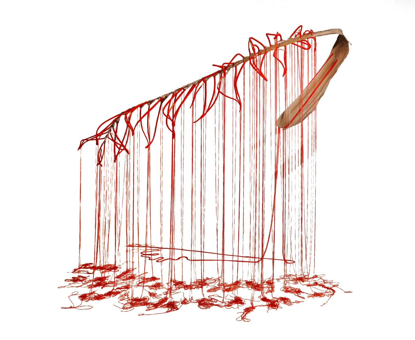 Working with discarded palm leaves stitched with fine red and black thread, Lina Gazzaz transforms organic remnants into tactile records of labor, time, and endurance. The surfaces resemble calligraphic scores, part botanical archive, part musical notation. Mapping cycles of growth, decay, and renewal. Rooted in Gulf ecologies and spiritual traditions, the palm emerges not as a symbol alone, but as an active witness to human and environmental transformation.