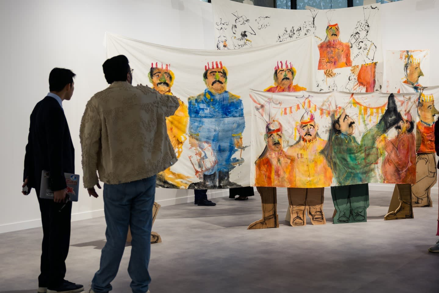 This curatorial approach is reflected in the composition of the fair itself. More than half of the artists participating in Art Basel Qatar’s first edition hail from the region, spanning North Africa, the Middle East, and South Asia, alongside international practices with long-standing engagements with questions of history, identity, and place. Across painting, installation, video, sculpture, and textile-based works. Many presentations return to themes of ancient civilisations, literary traditions, migration, and personal memory. While others address spectacle, power, commodification, and the aesthetics of authority. Together, they form a cross-section of practices shaped by ongoing processes of transition rather than fixed narratives.