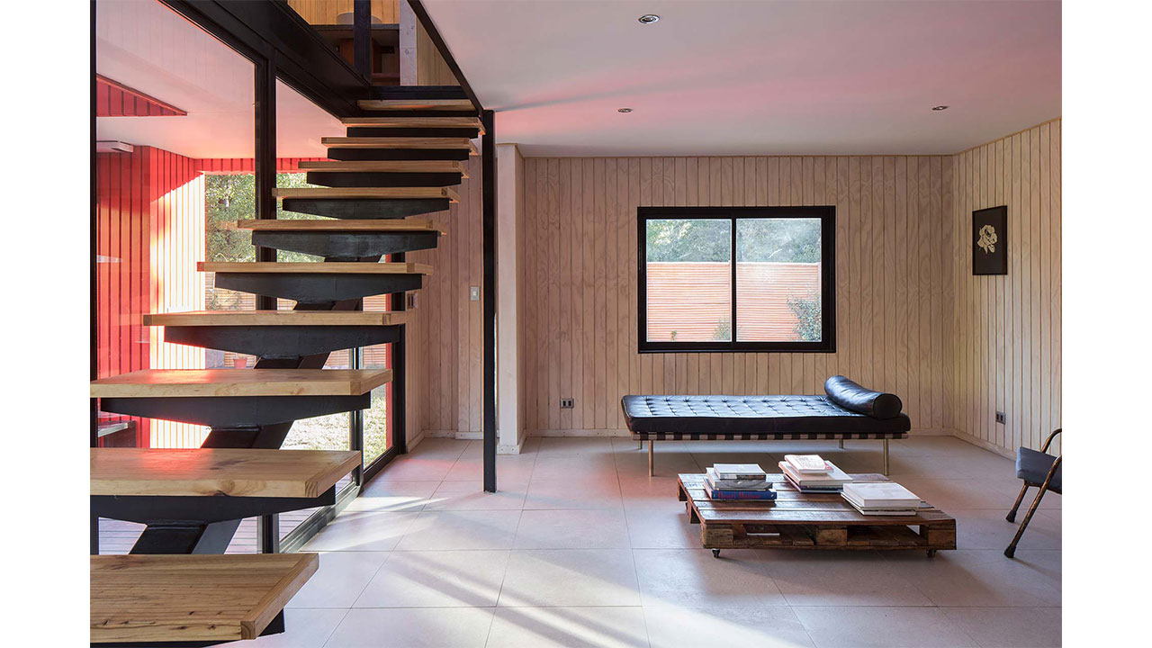 What it lacks in modest size has been made up in striking colour and interior design. Contrasting the bold facade, the interior takes on a a more muted colour palette with accents of red as well as continual theme of natural stone and timber throughout the home. To break up the colour, black steel frames the house and windows, all while in keeping with the minimalist decor.