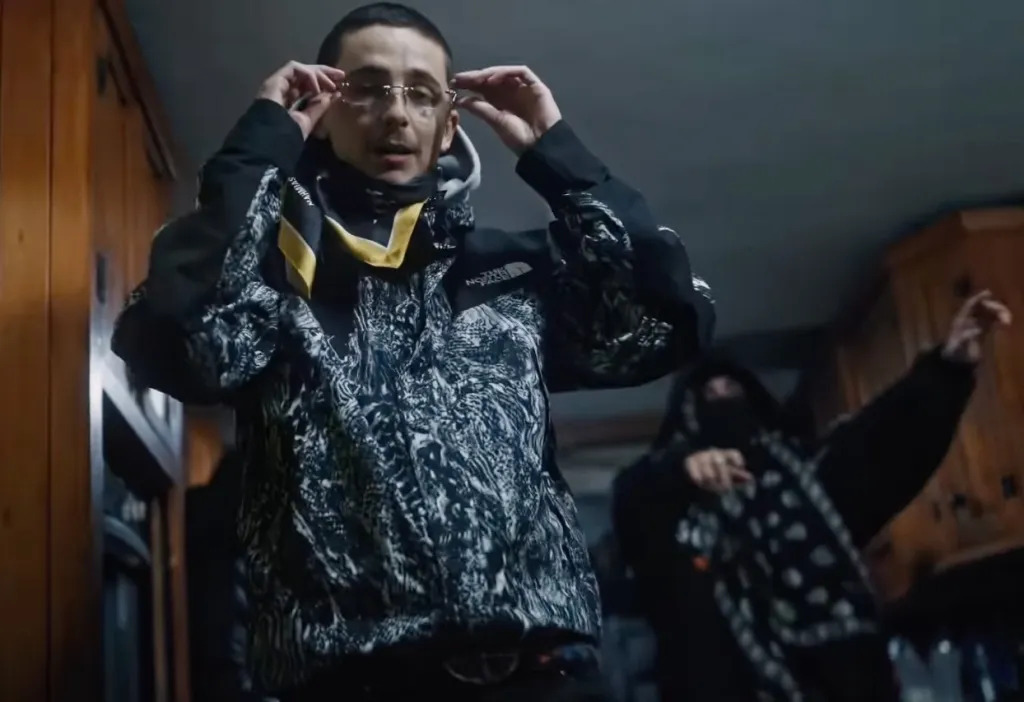 The Oscar-winning actor tapped into a distinctly British take on streetstyle in his music video for the “4 Raws” remix, an unexpected musical collaboration he did with underground rapper EsDeeKid from Liverpool, ultimately debunking the theories that he’s EsDeeKid himself. In the music video, he dons a snake print North Face Gore-Tex Mountain Jacket and baggy black pants, paired with MM6 Maison Margiela x Dr. Martens 1460 boots. He also wore the same Chrome Hearts belt he wore at his ping pong event, which was highlighted in the video for several seconds.