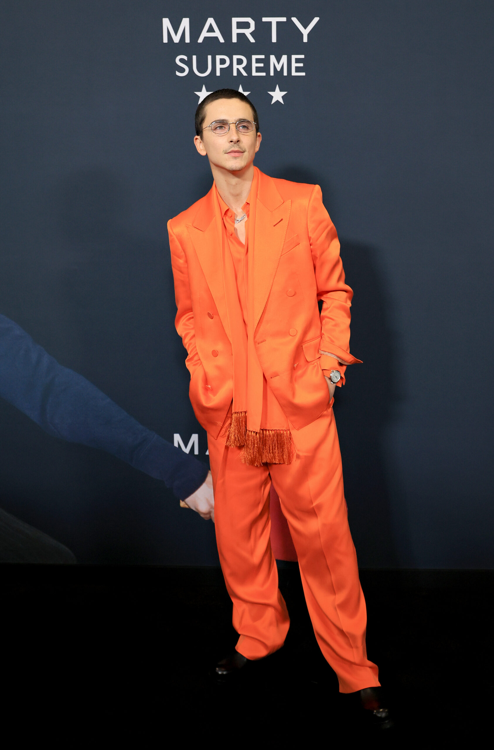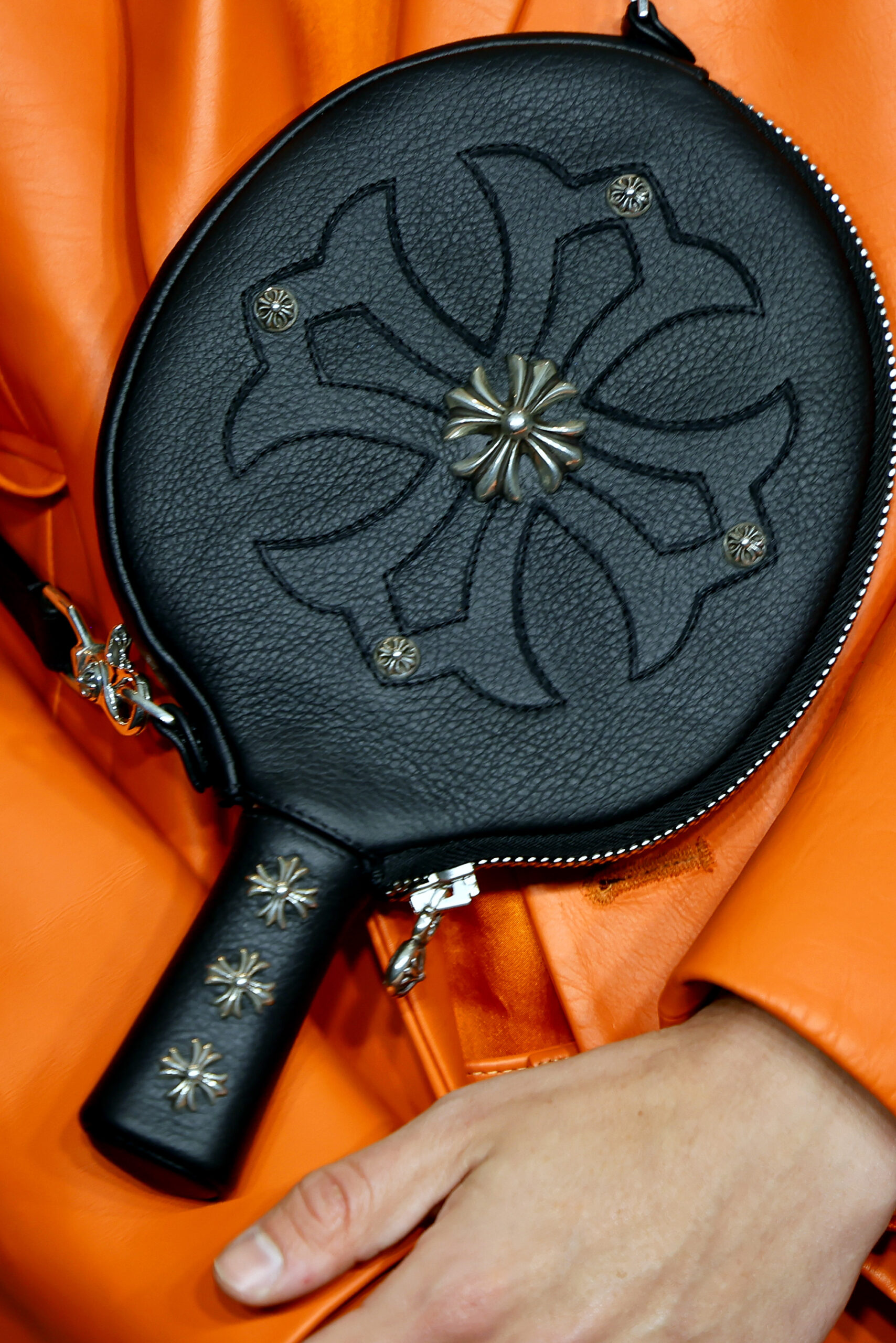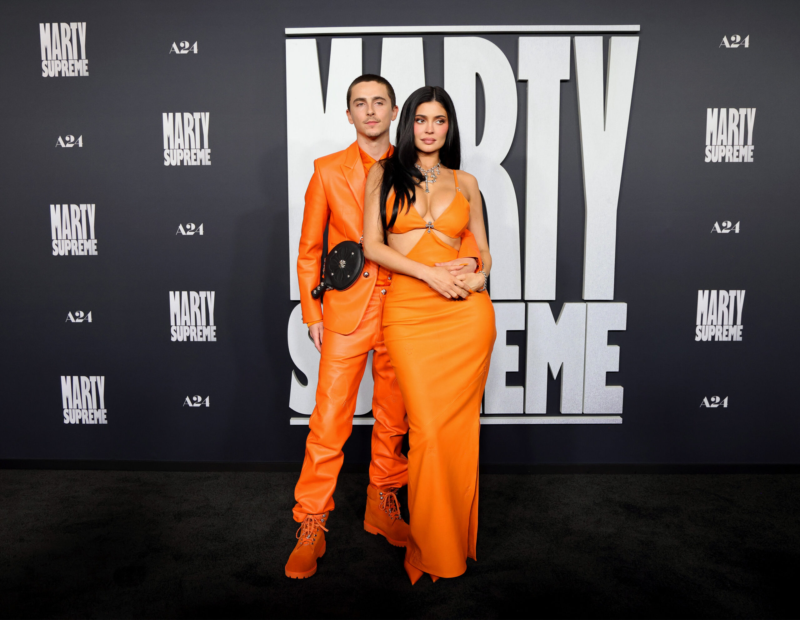The lead actor donned a custom Chrome Hearts all-leather jacket and pants with a dress shirt in the same ‘Marty Supreme’ neon orange, a nod to the iconic orange ping pong balls. Paired with this vibrant look were Chrome Heart x Timberland boots featuring Chrome Heart’s signature overlapping crosses, and a Chrome Heart table tennis paddle-shaped cross-body bag. His fashion-forward girlfriend, Kylie Jenner, wore a matching Chrome Hearts leather dress with complementary jewellery.