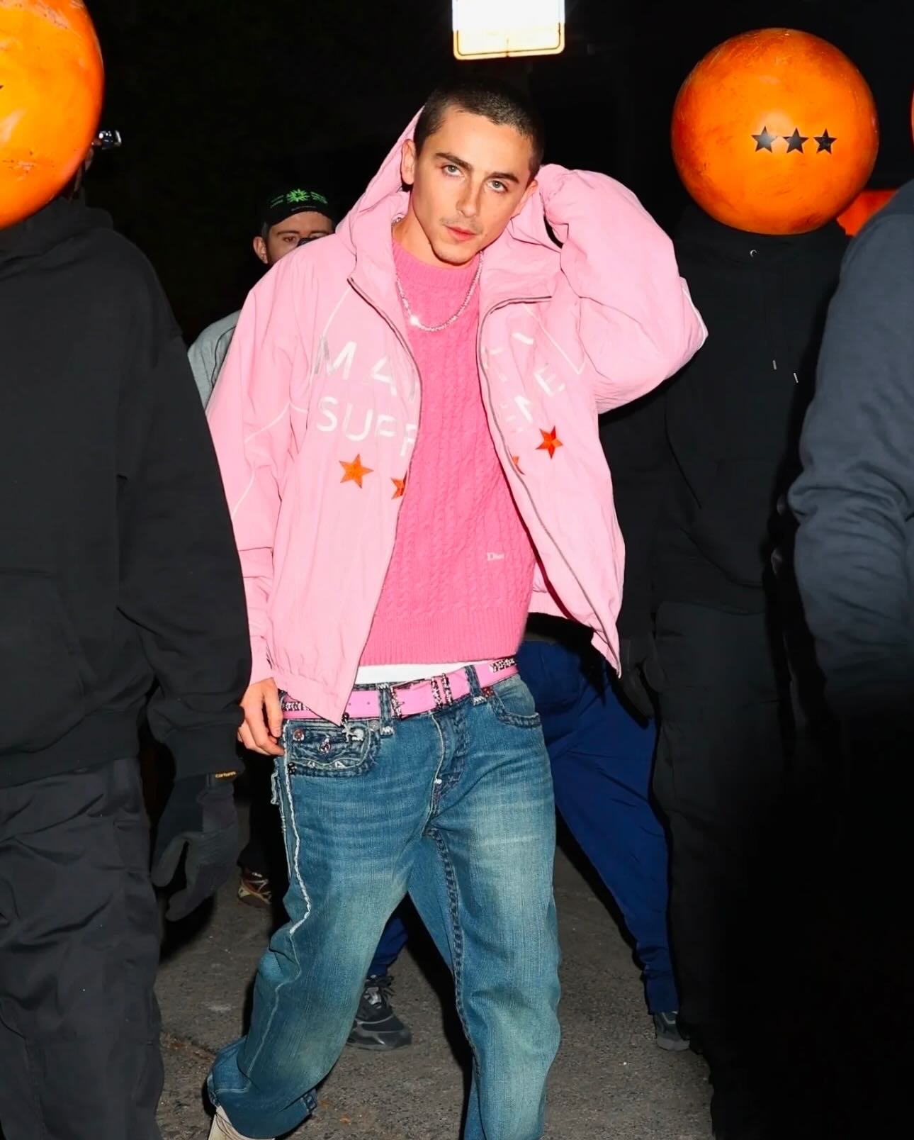 Chalamet embraced the streetstyle aesthetic of New York City during the SoHo pop-up of the Marty Supreme x Nahmias collaboration. He wore the famous Marty Supreme retro sports-style jacket in a soft pink, layered above a darker pink Dior cable-knit sweater. Simple blue denim jeans were punctuated with a pop of color through a pink and silver handwear belt. The star of the show was his pastel multi-coloured Dior by Johnathan Anderson high-top sneakers from the Spring 2026 runway.