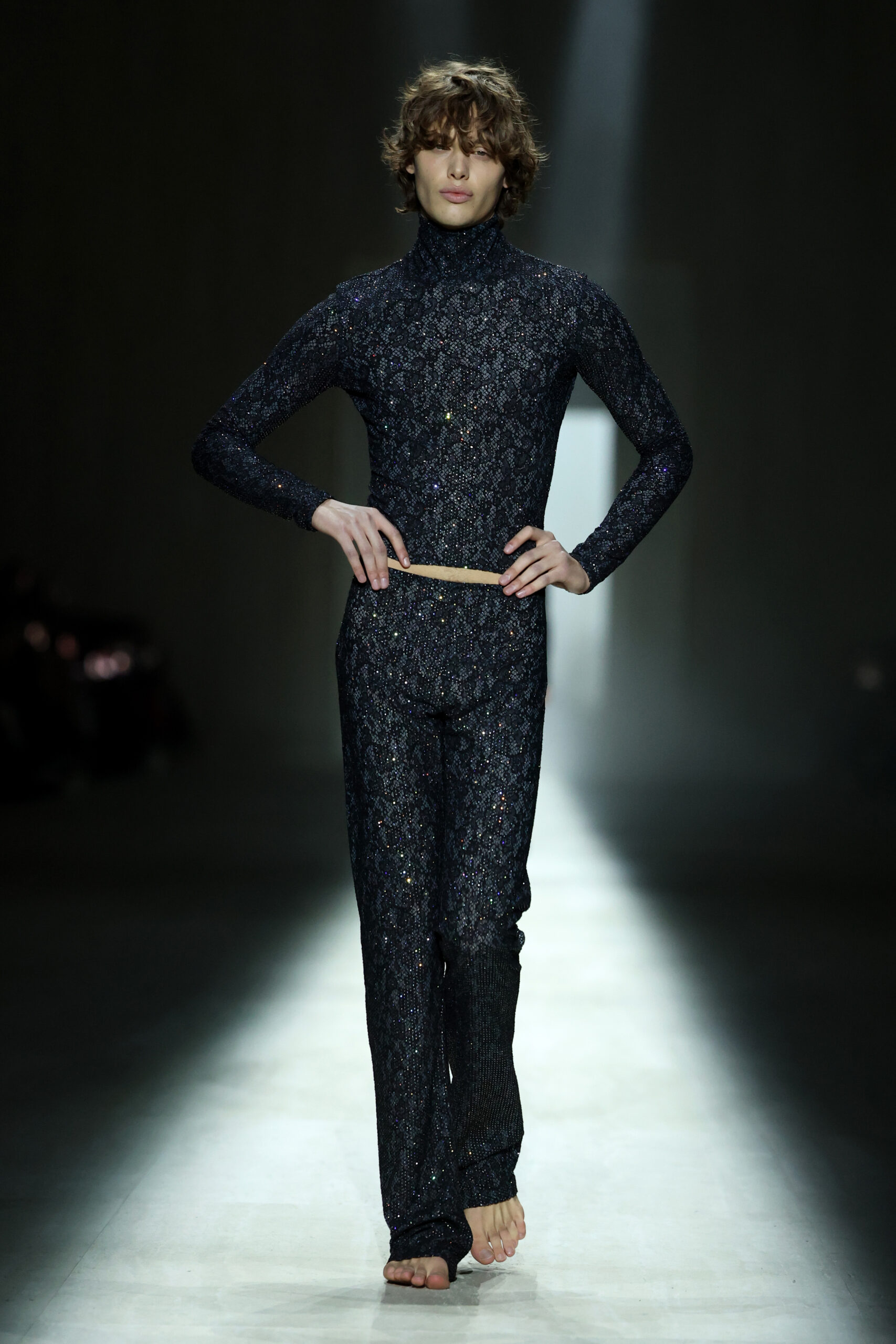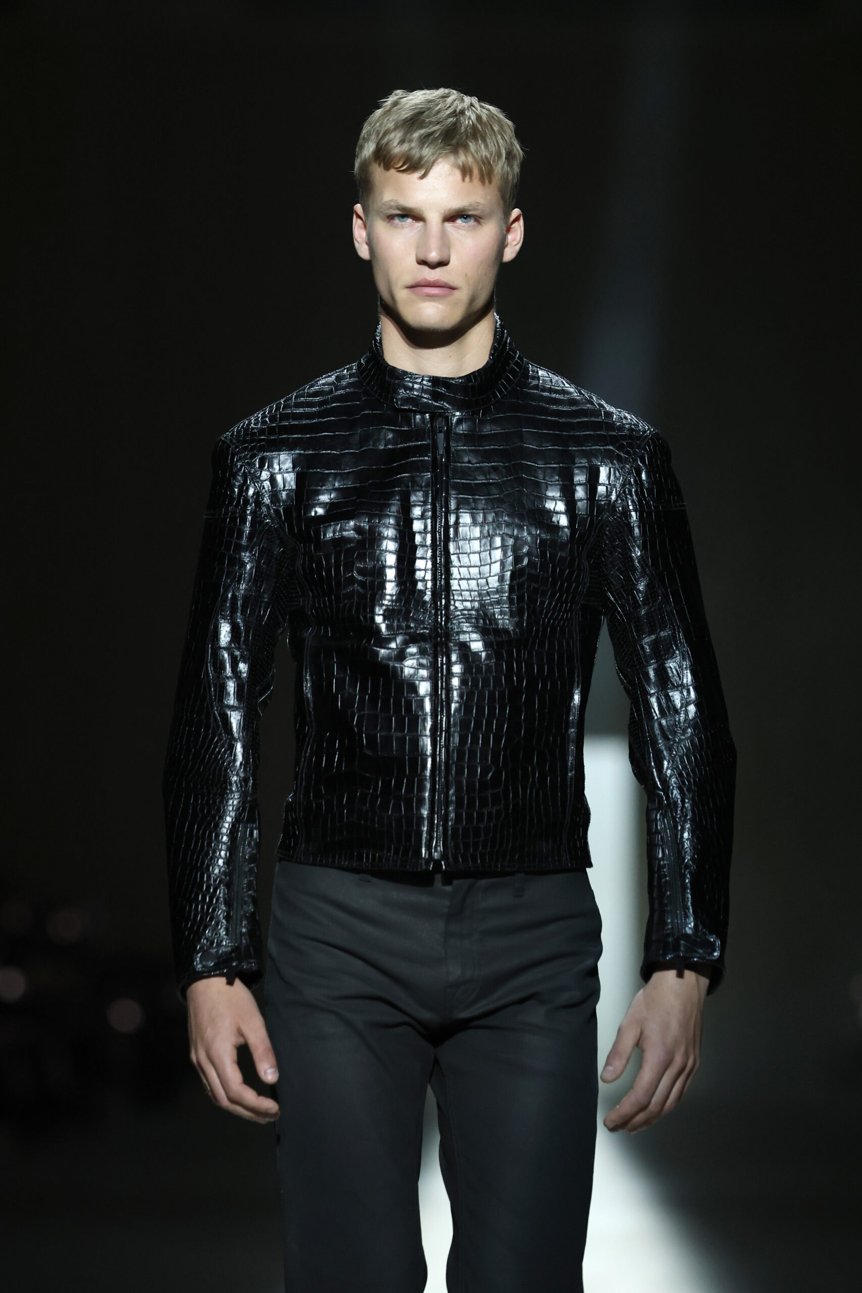 Demna’s ongoing experimentation with hybrid garments was evident throughout. Tracksuits were reimagined as modern trackdresses; leggings fused with trousers; tops and jackets merged into ultra-fitted single garments. Bombers and bubble jackets were lined with voluminous feather embroideries, framing the wearer’s face, while soft, pliable leathers lent ease to fitted pants, bikers, and plush circular stoles.
