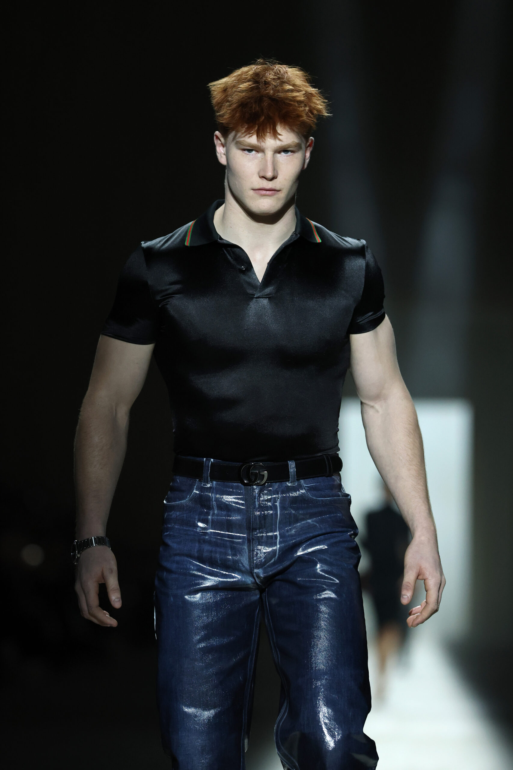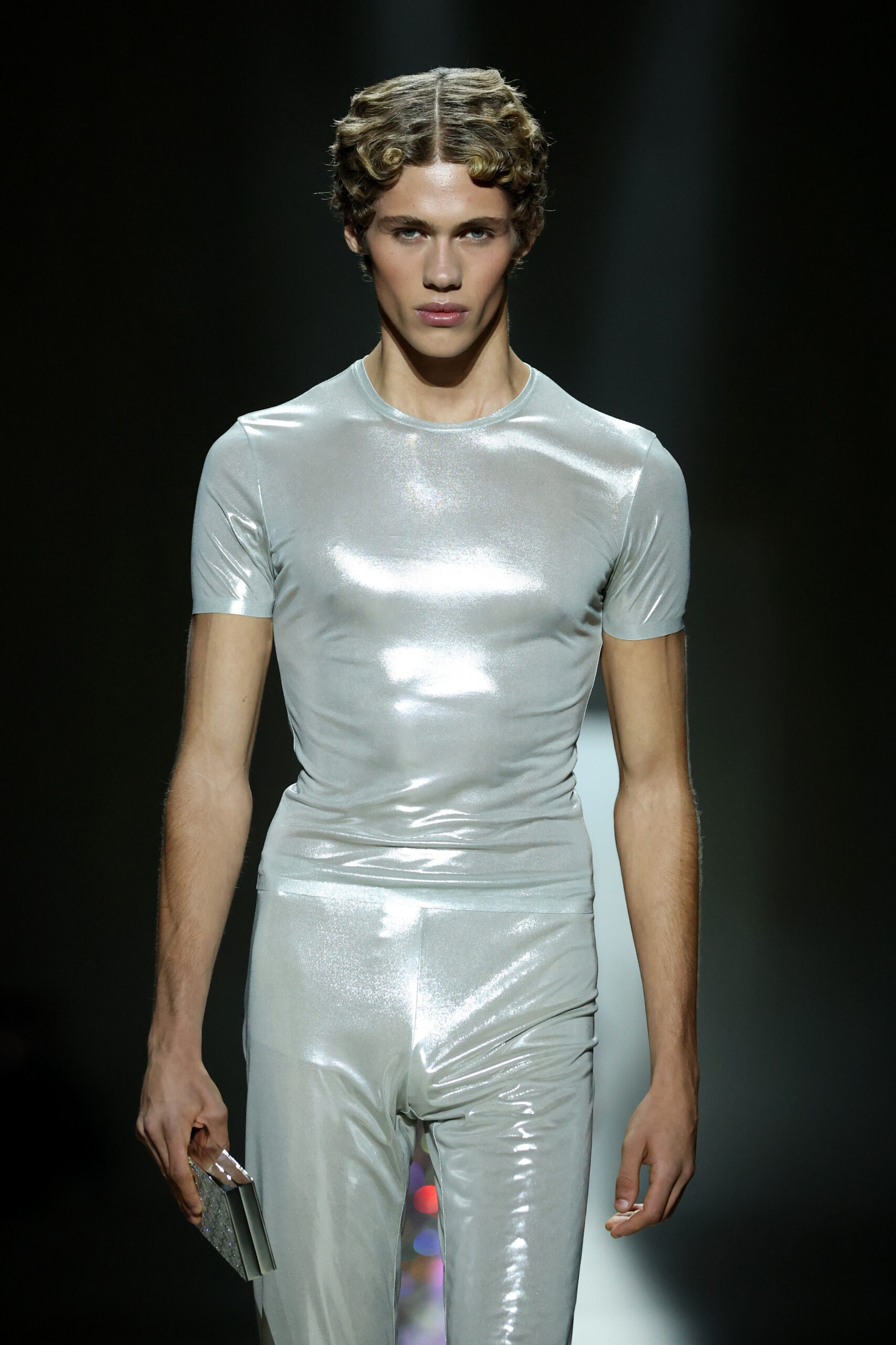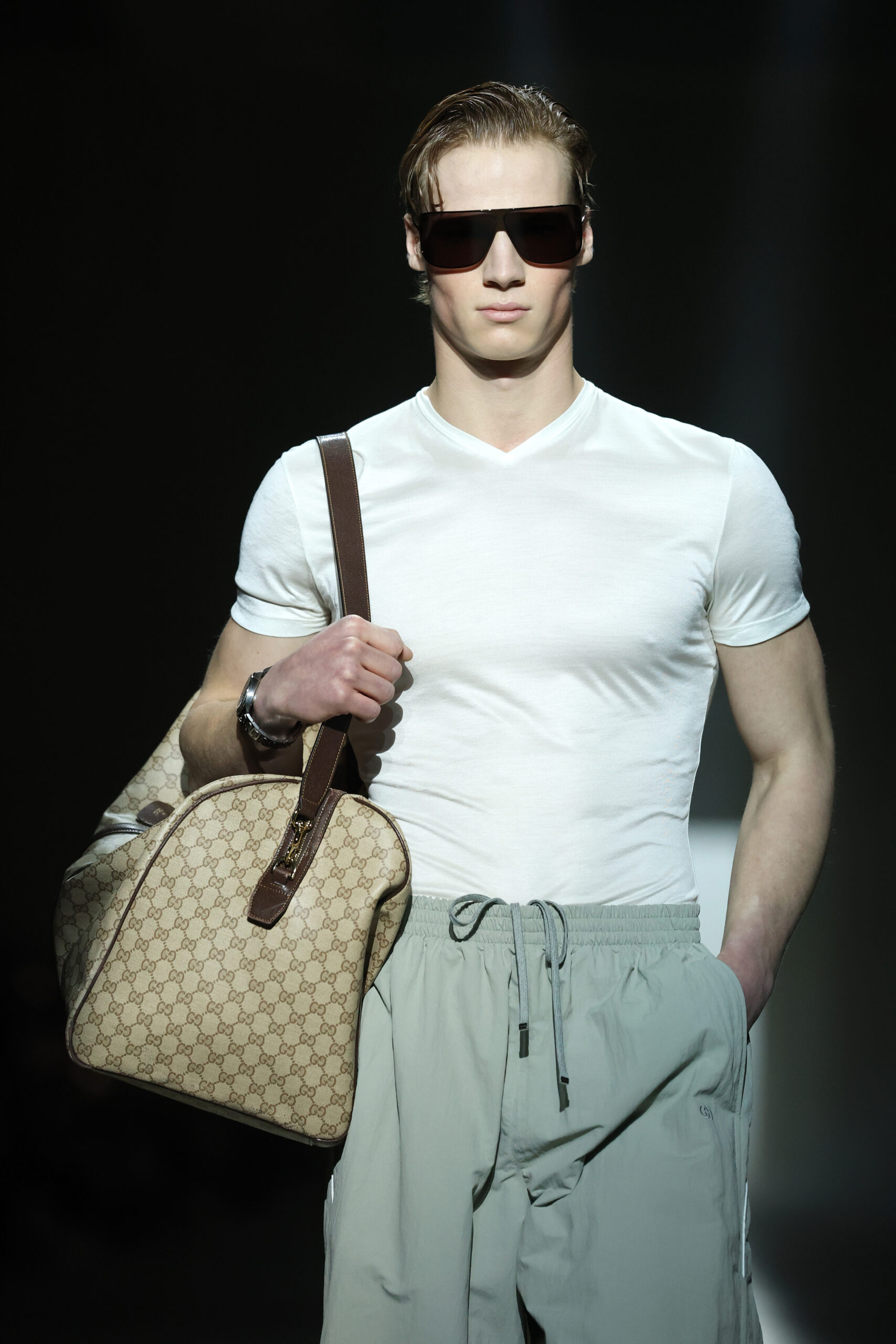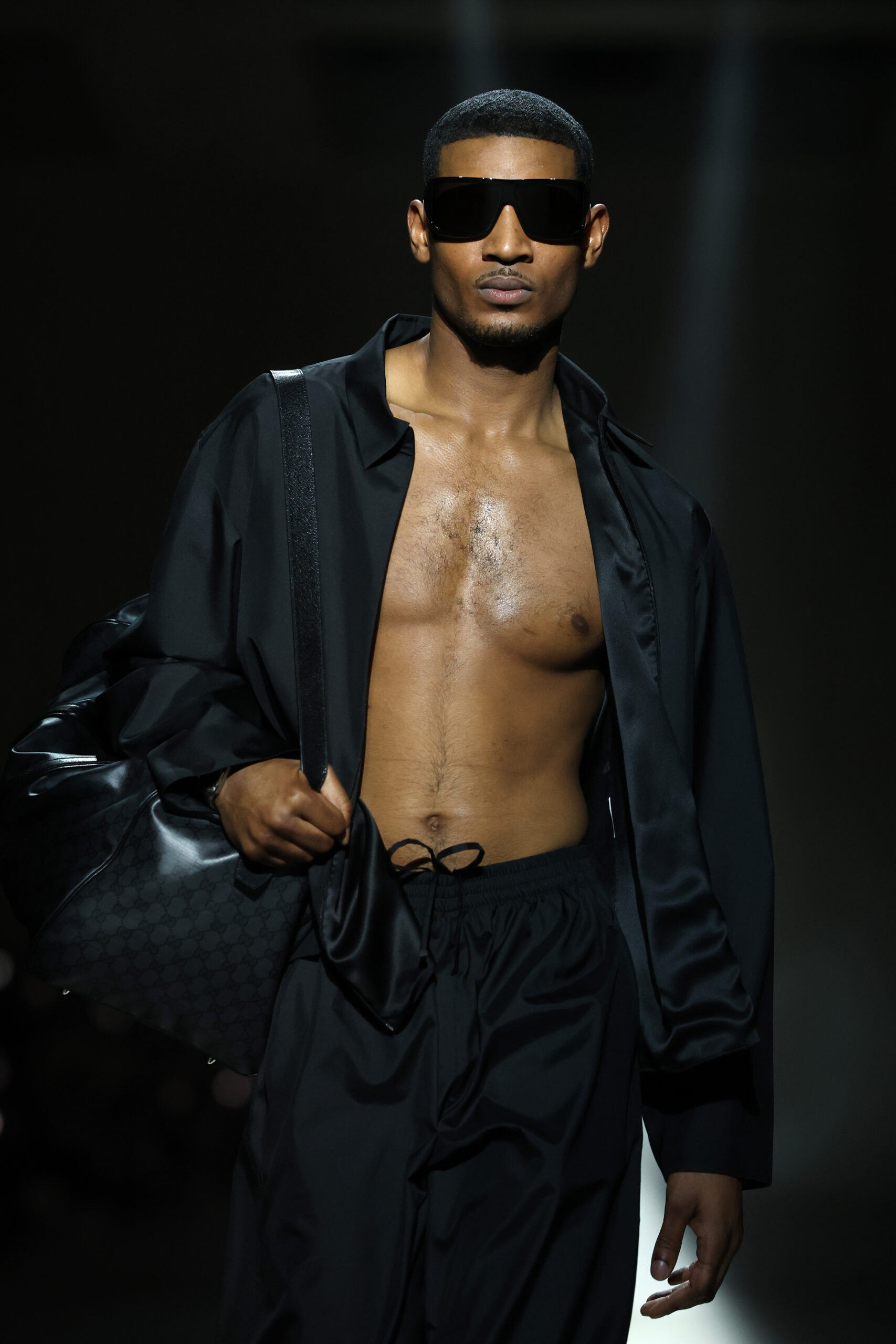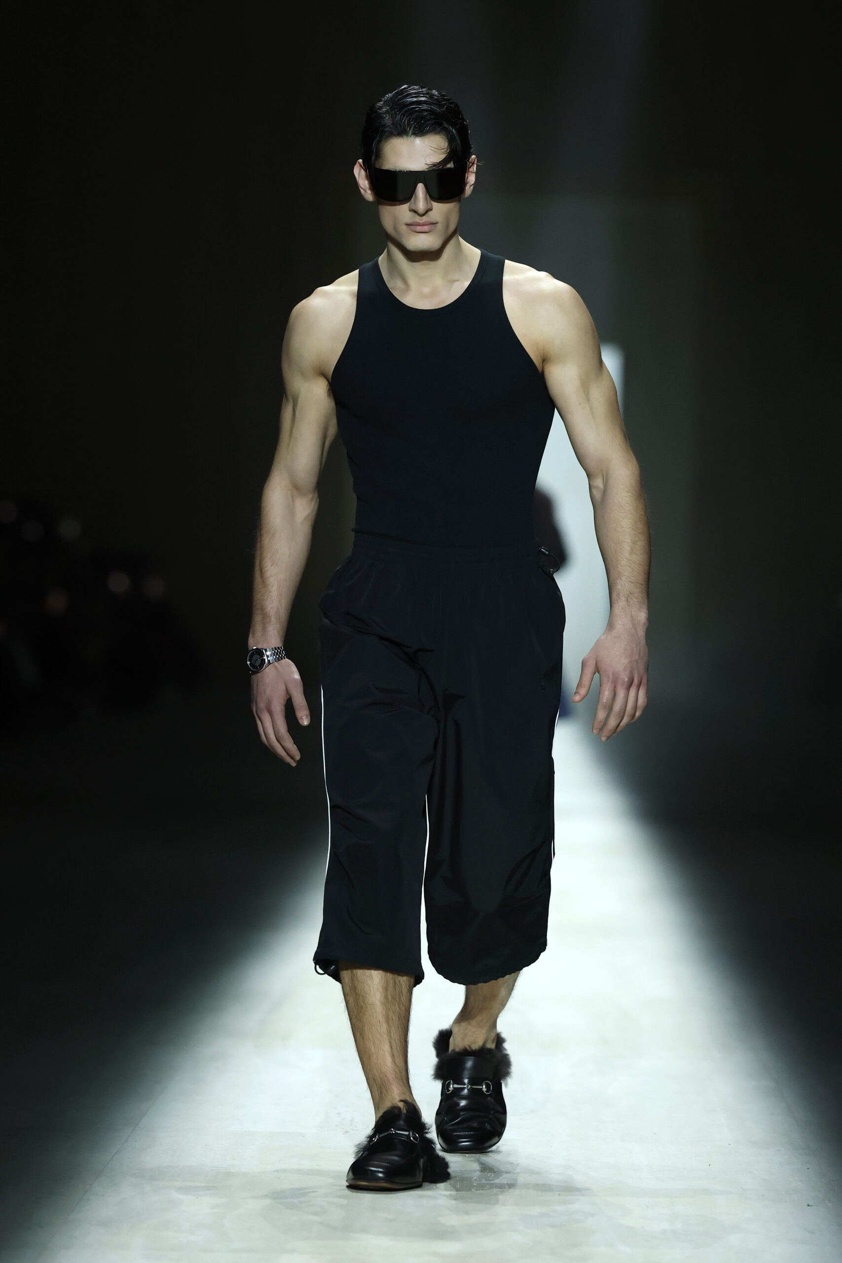 Footwear and accessories carried the same attention to detail and movement. The Manhattan sneaker blended a minimal basketball-inspired shape with moccasin-style slip-on ease. Giovanni and Cupertino loafers erased stiffness, while other designs fused sneakers and leather shoes into sculptural, aerodynamic forms. Bags included an updated Gucci Bamboo 1947 with a flexible, pieced-leather handle, and archival minaudières scaled to hold a phone and essentials.