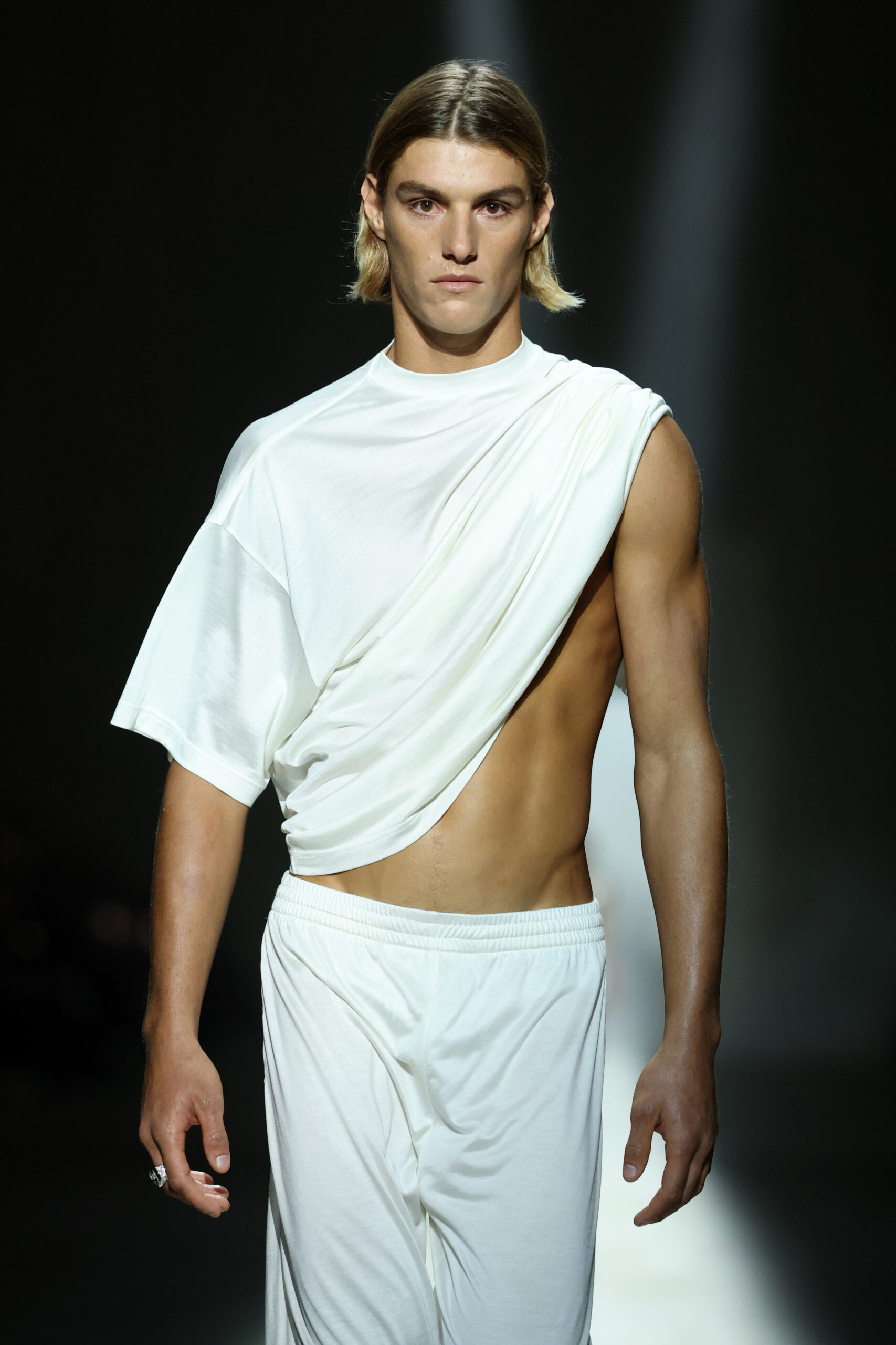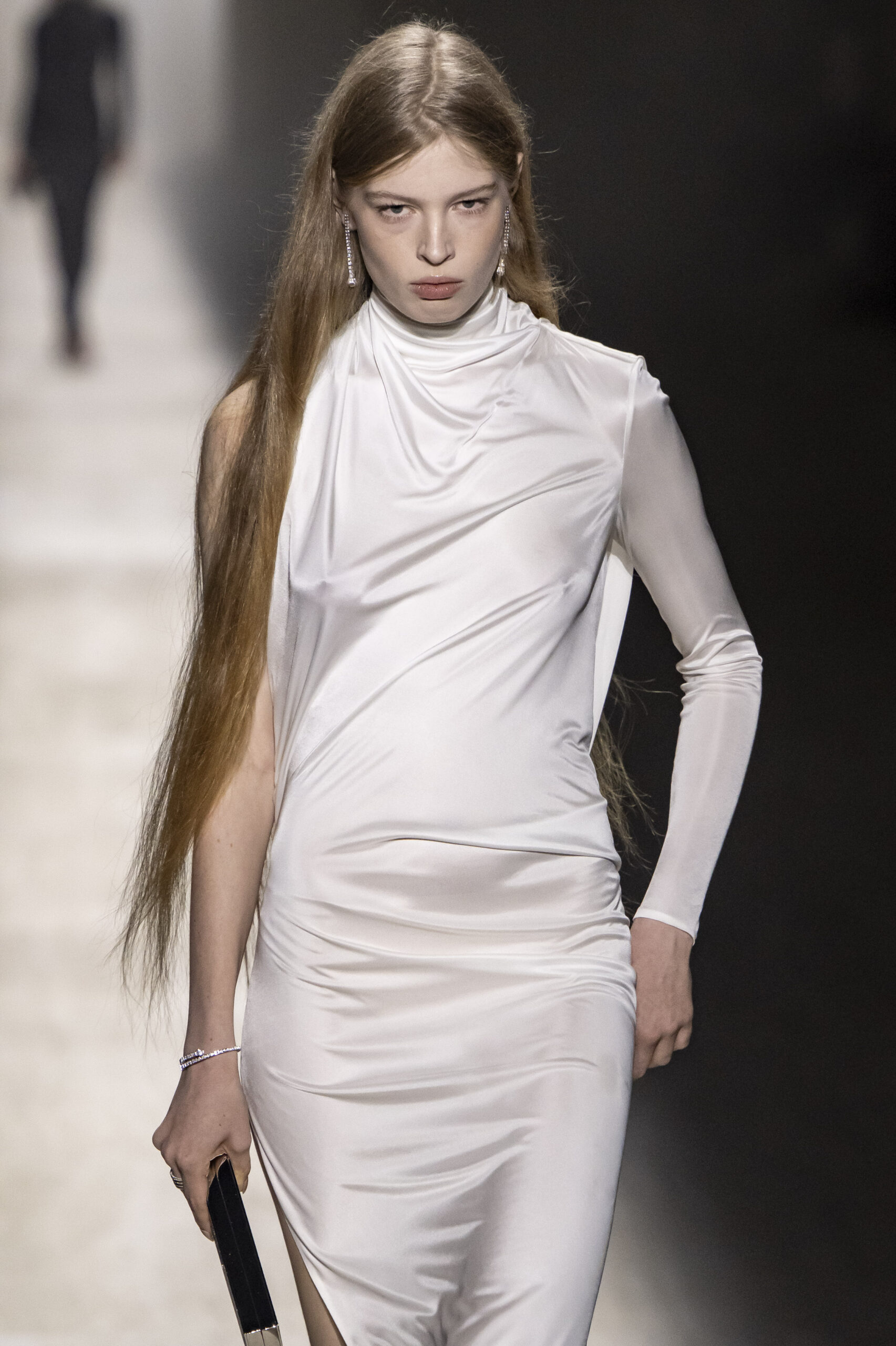 Demna also referenced classical statuary in his aesthetic, translating Renaissance ideals of proportion and physique into modern silhouettes: chiseled menswear, skater-style T-shirts draped in Graecian folds, and flowing gowns that evoked the Birth of Venus. The collection reflected a clear Gucci product language: seamless construction, body-aware silhouettes, engineered curved hems, and attention to movement. Voluminous feathered jackets, supple leather pieces, and hybrid garments emphasised ease, comfort, and versatility, creating a runway playbook for the modern Gucci wearer. From everyday staples to statement pieces, Demna presented a wardrobe that felt alive, personal, and unmistakably Gucci.