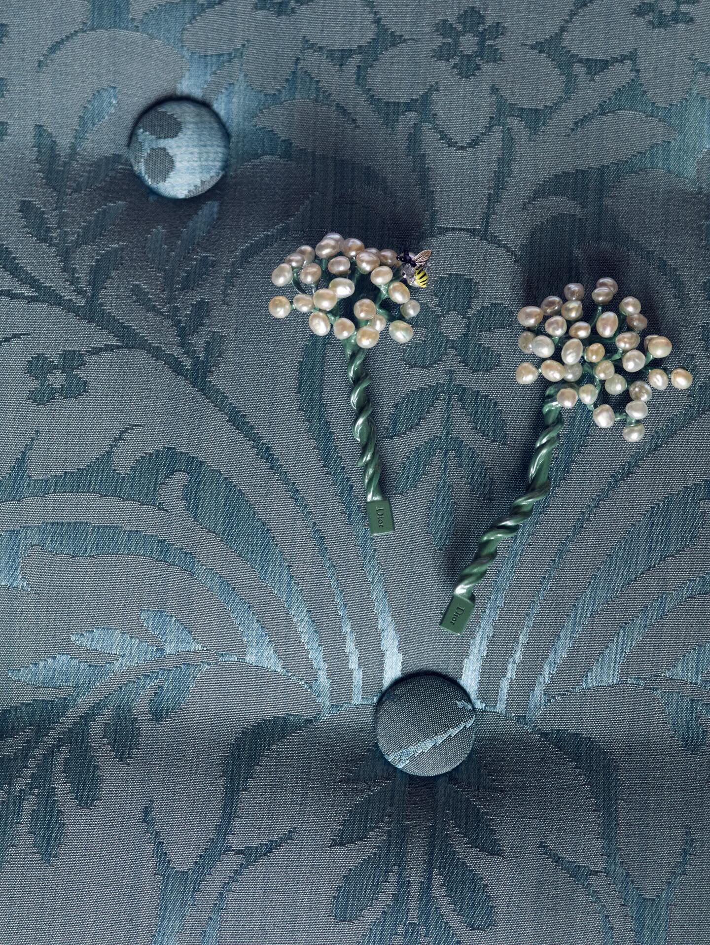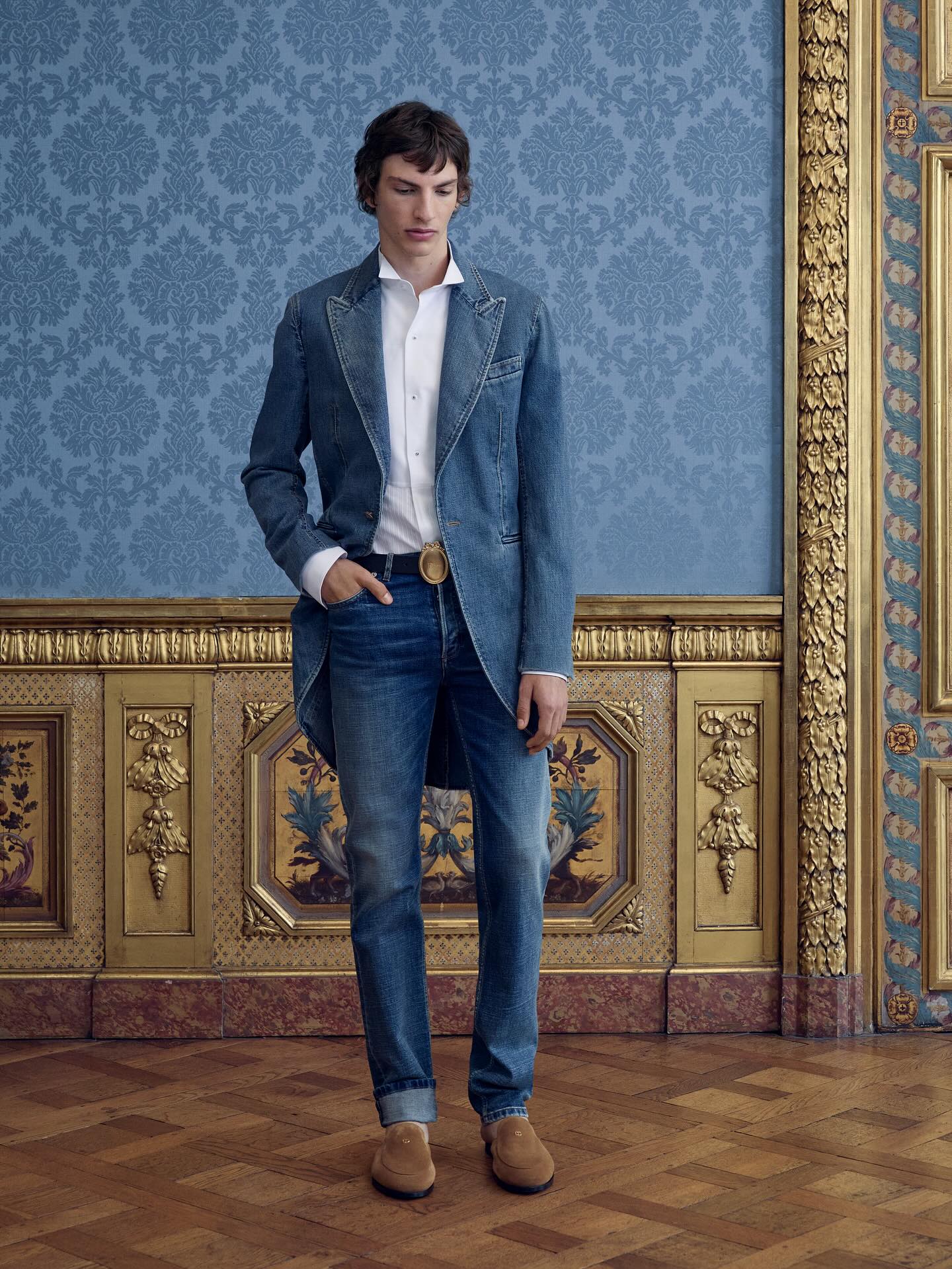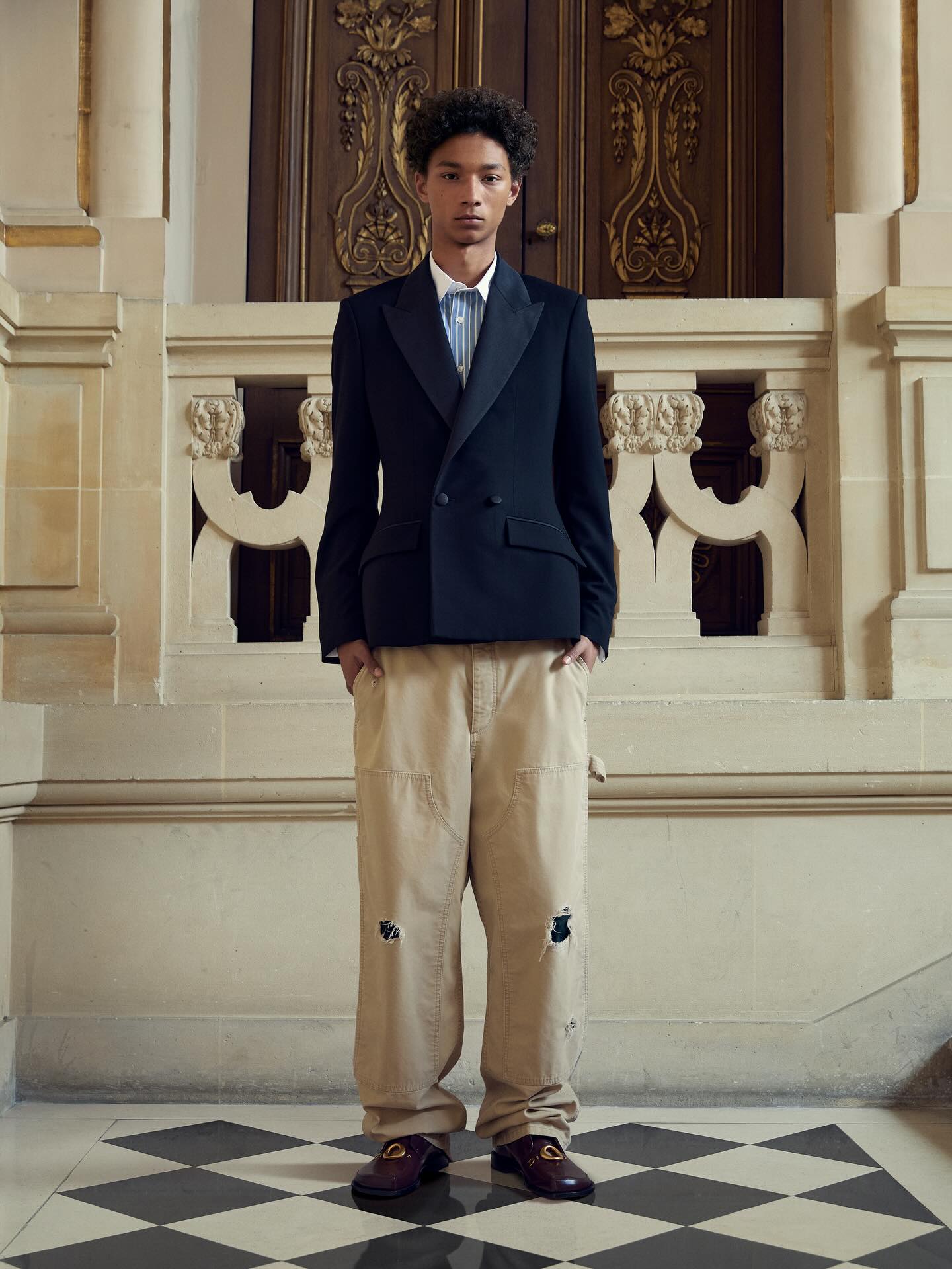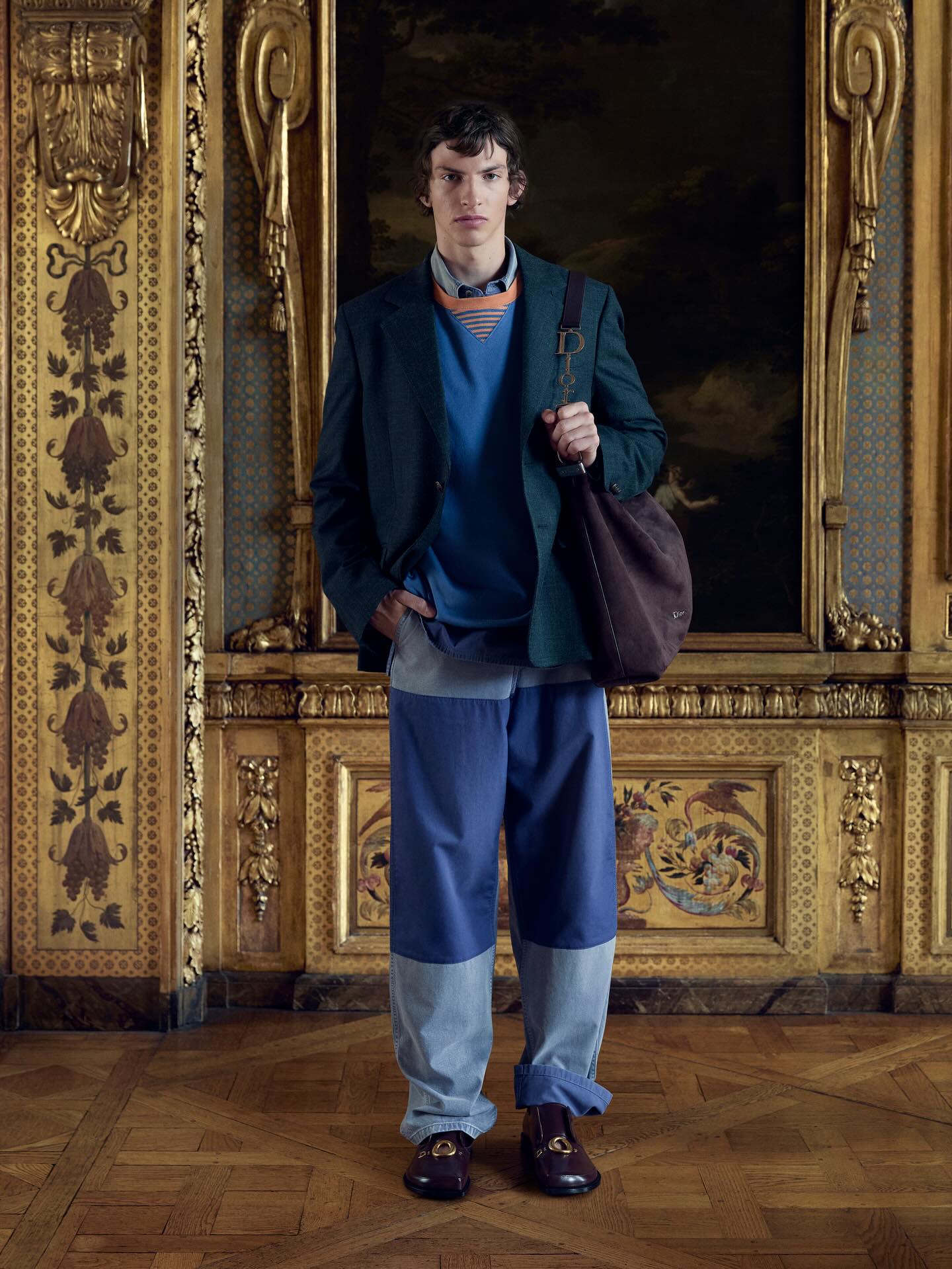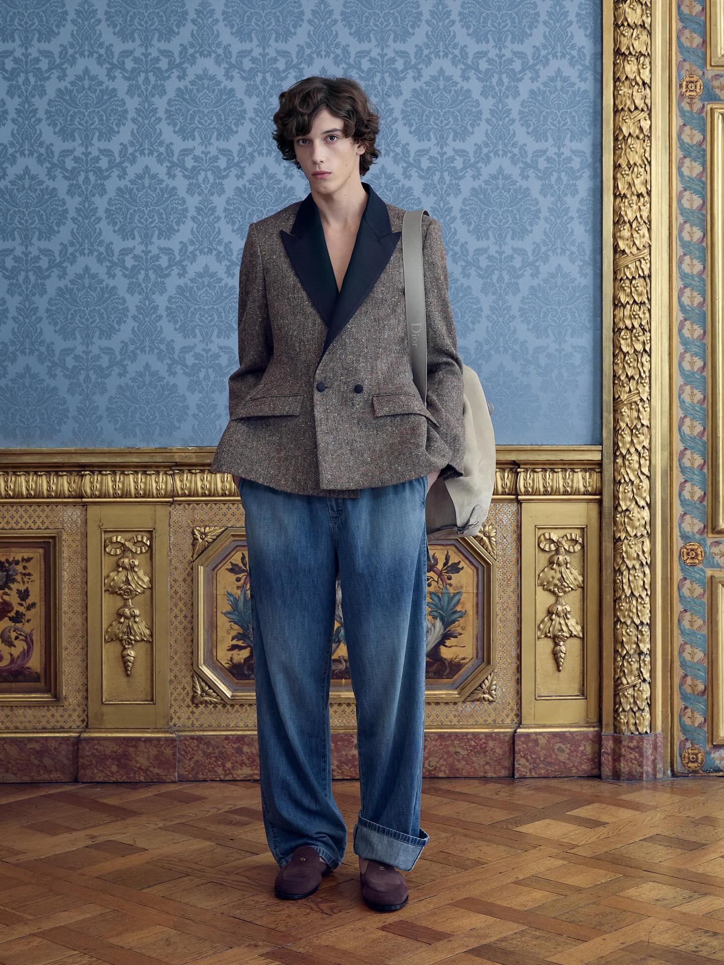 Throughout the collection, Anderson’s mastery of balancing high and low shines. A sculpted navy blazer and a pinstriped shirt are intentionally grounded by distressed, double-kneed carpenter pants; elsewhere, a brown Donegal-tweed blazer is paired with baggy jeans, suede loafers, and a slouchy shoulder bag. His love of 18th-century elegance appears again in raw-denim frocks and sharply cut Bar-inspired mini jackets rendered in petrol-green tweed. It’s a continuation of the lexicon he is establishing for Dior but more casual, more lived-in, and yet still in attunement with the universe he’s constructing at Dior.