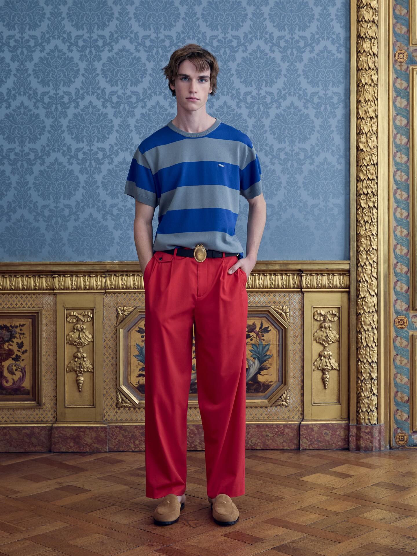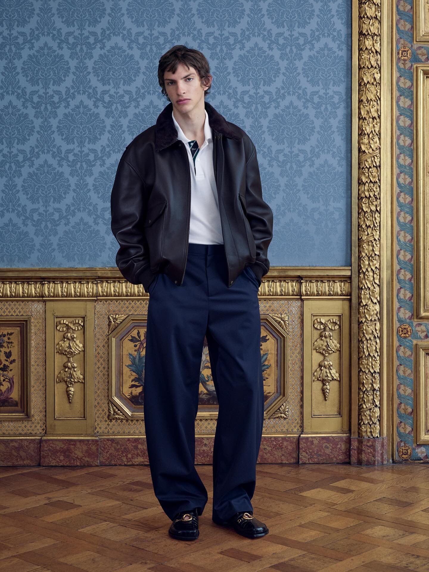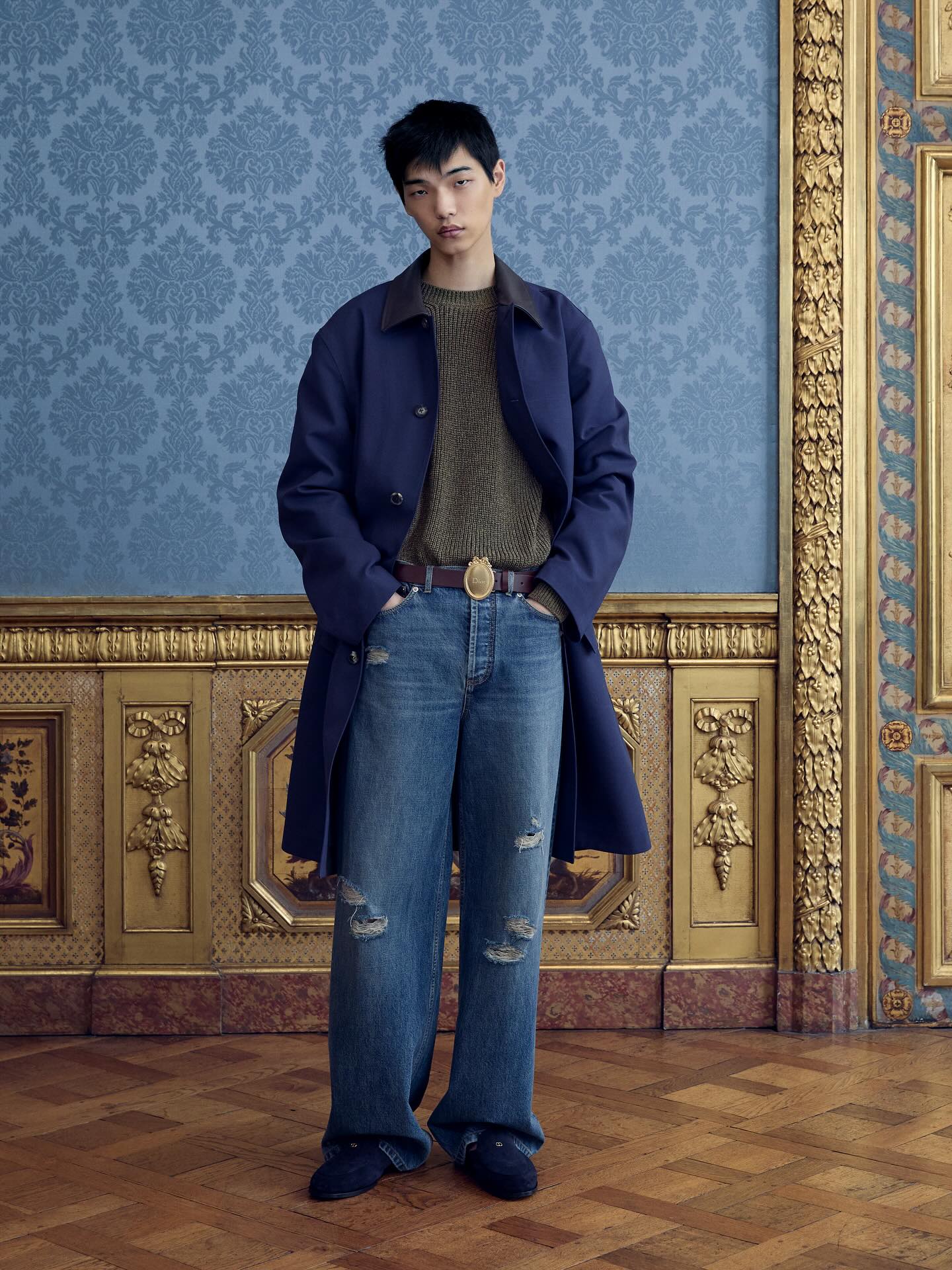 From the gilded age backdrop of a manor on Île Saint-Louis in Paris materializes the second chapter in Anderson’s journey towards forging a new lexicon for Dior menswear. This collection is unmistakably steeped in historicism and aristocratic grandeur, yet constantly blended with subdued minimalistic sensibilities. At centerpiece are embroidered 18th-century inspired frock coats and blousons in royal blue; rich and ornate, yet modernized by pairings with tapered, light-wash jeans. Anderson has also revisited his now-signature “Delft” cargo shorts from SS26 — this time reworked with oversized medieval crests, maritime references and a regal attitude, styled against relaxed knits and burgundy loafers.