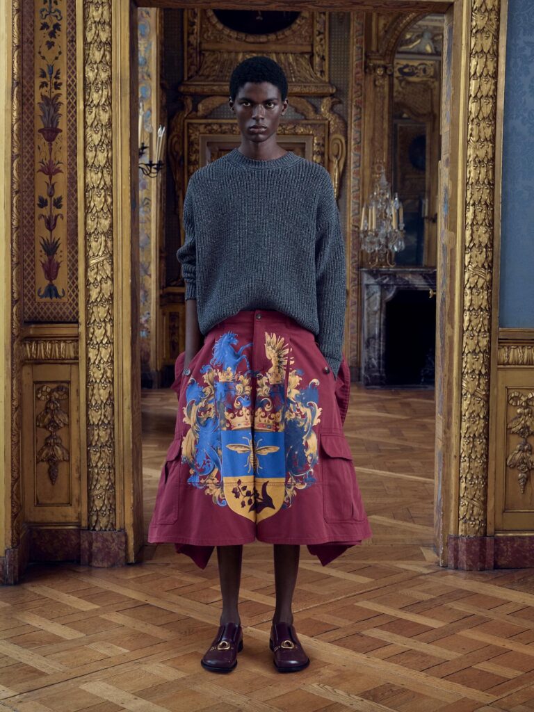 From the gilded age backdrop of a manor on Île Saint-Louis in Paris materializes the second chapter in Anderson’s journey towards forging a new lexicon for Dior menswear. This collection is unmistakably steeped in historicism and aristocratic grandeur, yet constantly blended with subdued minimalistic sensibilities. At centerpiece are embroidered 18th-century inspired frock coats and blousons in royal blue; rich and ornate, yet modernized by pairings with tapered, light-wash jeans. Anderson has also revisited his now-signature “Delft” cargo shorts from SS26 — this time reworked with oversized medieval crests, maritime references and a regal attitude, styled against relaxed knits and burgundy loafers.
