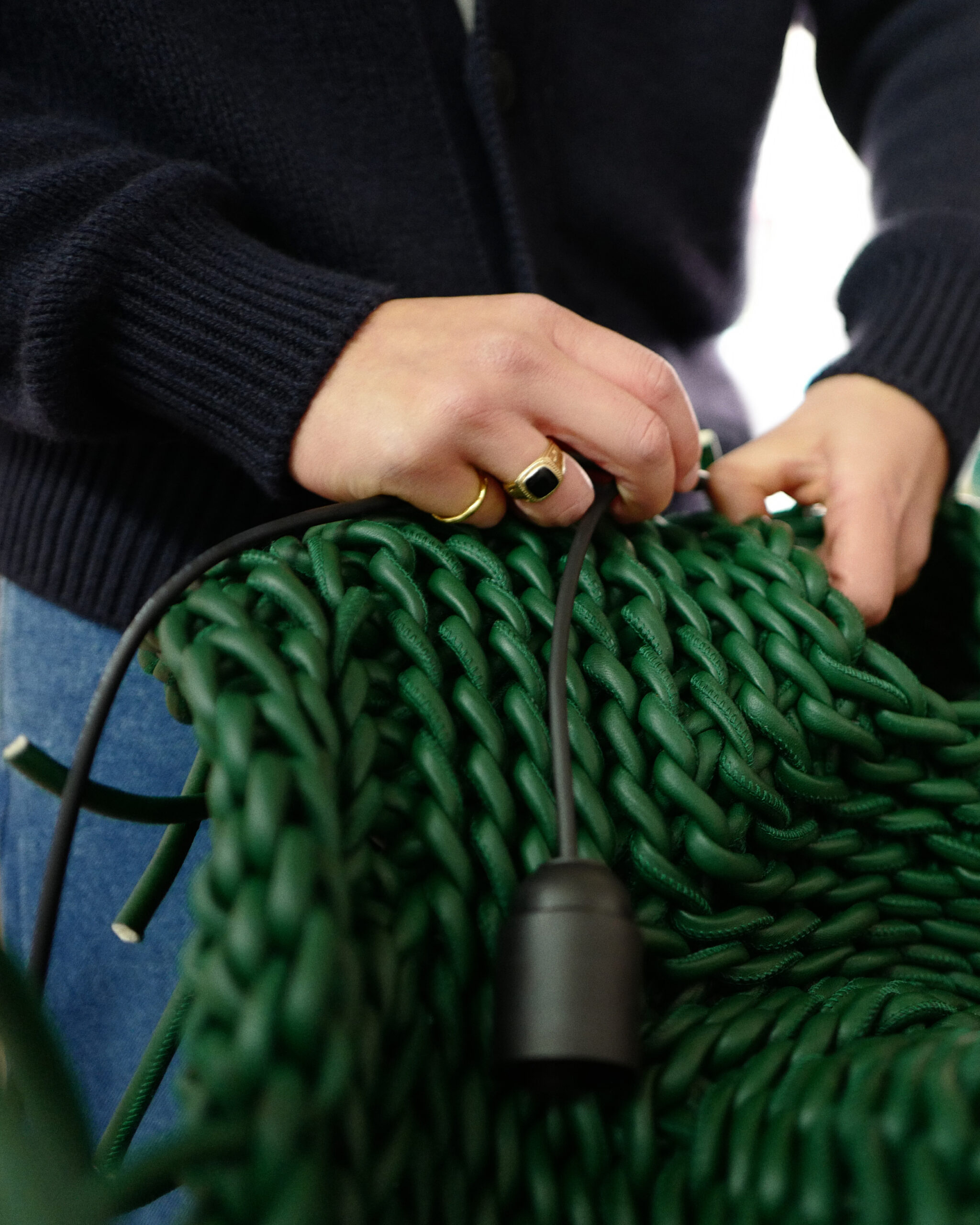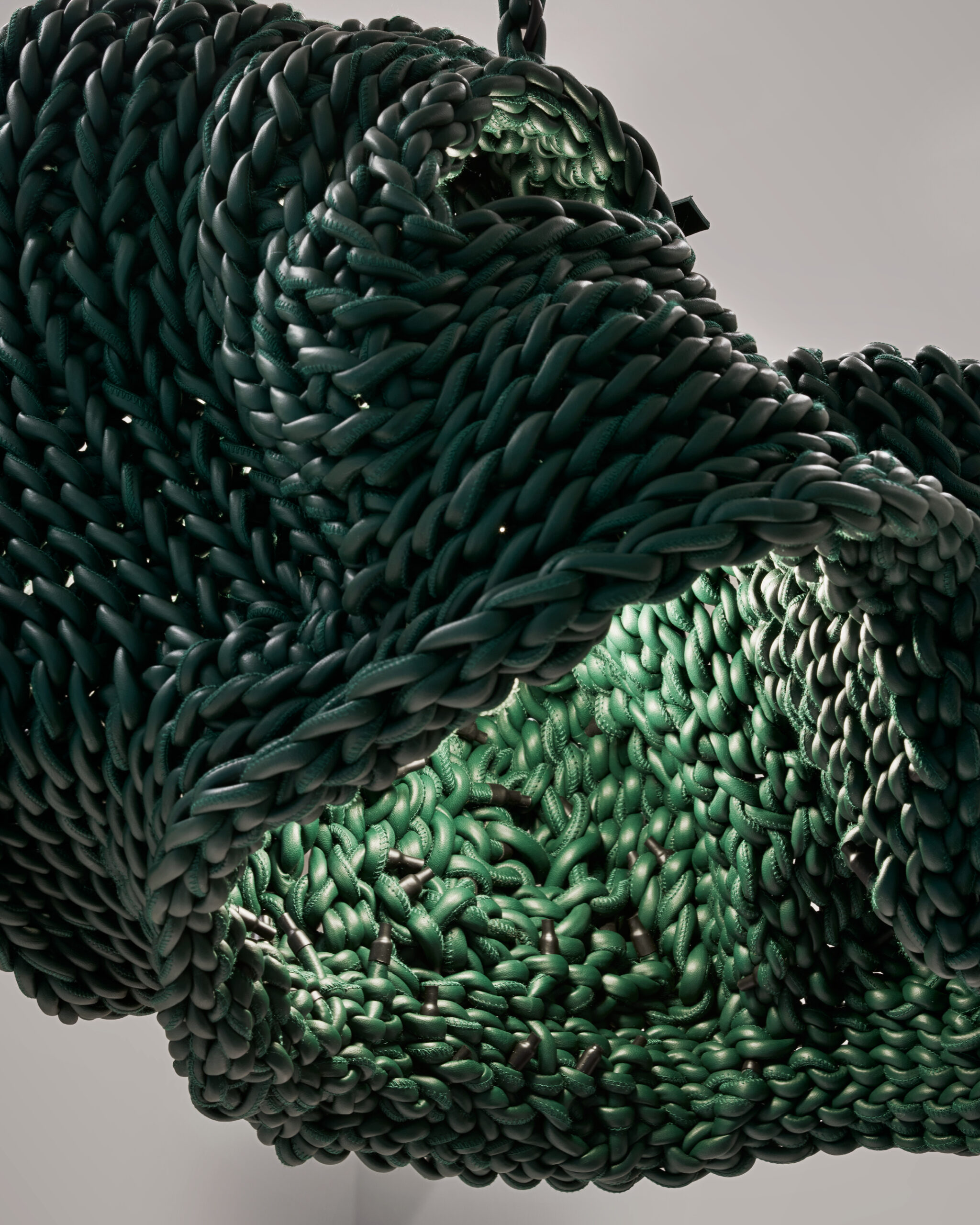 Bottega Veneta’s third collaboration with Korean artist Kwangho Lee under Louise Trotter’s creative direction produced Lightful, a site-specific installation at the Via Sant’Andrea store combining Lee’s characteristic suspended woven forms with new light sculptures woven from Bottega’s leather fettucce strips. In black and green chosen by Trotter, each sculpture holds an organic shape that reads as both architectural and alive. Lee visited the Bottega atelier in Montebello Vicentino during the development process, and it shows in the intimacy of the result. A house that has always built its identity around weaving finding an artist whose entire practice is about what happens at the moment materials meet: it’s a natural pairing that keeps getting better.
