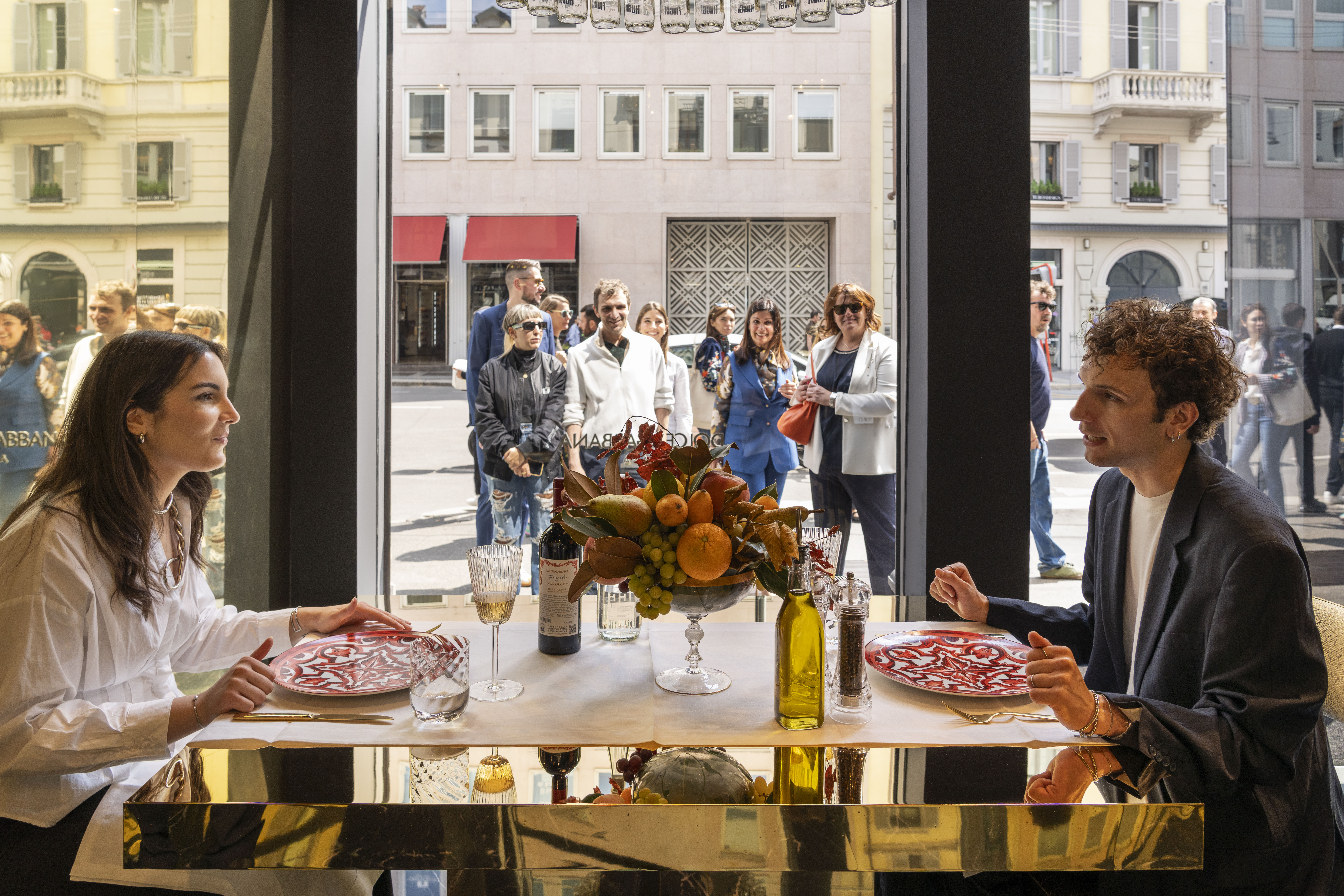 Dolce&Gabbana Casa continued building out its interiors universe in collaboration with Luxury Living Group, presenting new collections across indoor and outdoor furniture at Via Durini 23. Soft lines and sinuous geometries define the interior Moss and Gardenia collections; the Saint Jean outdoor line expands with the house’s signature prints — Leopard, Zebra, Sicilian Cart, Blu Mediterraneo majolica tiles — applied to sofas, loungers, and round tables. At Corso Venezia 7, the window displays were given over to The Italian Lunch, an act of love, a live performance running twice daily through the week: the table as theatre, Mise en Place as gesture. Maximalism done right.