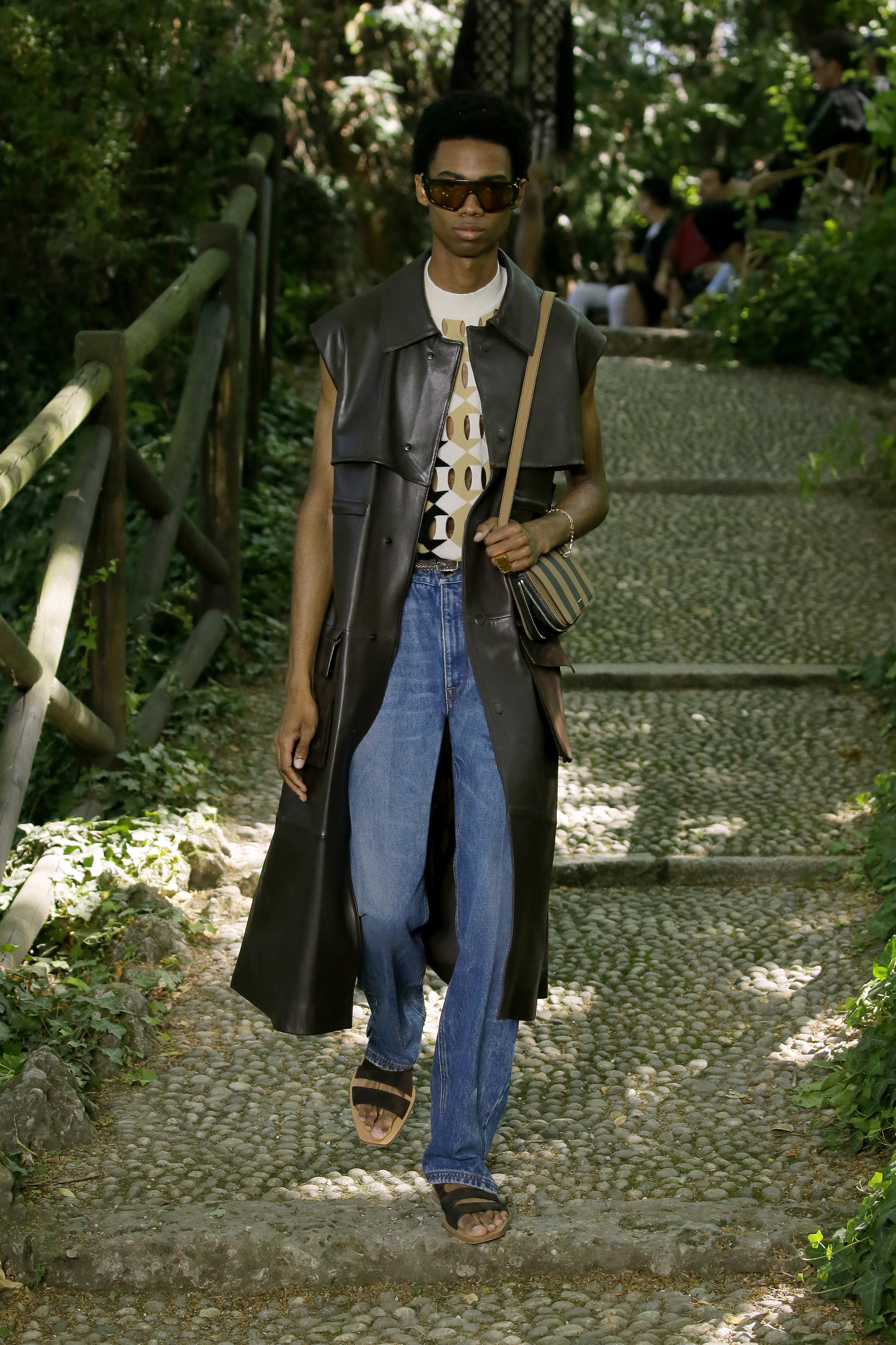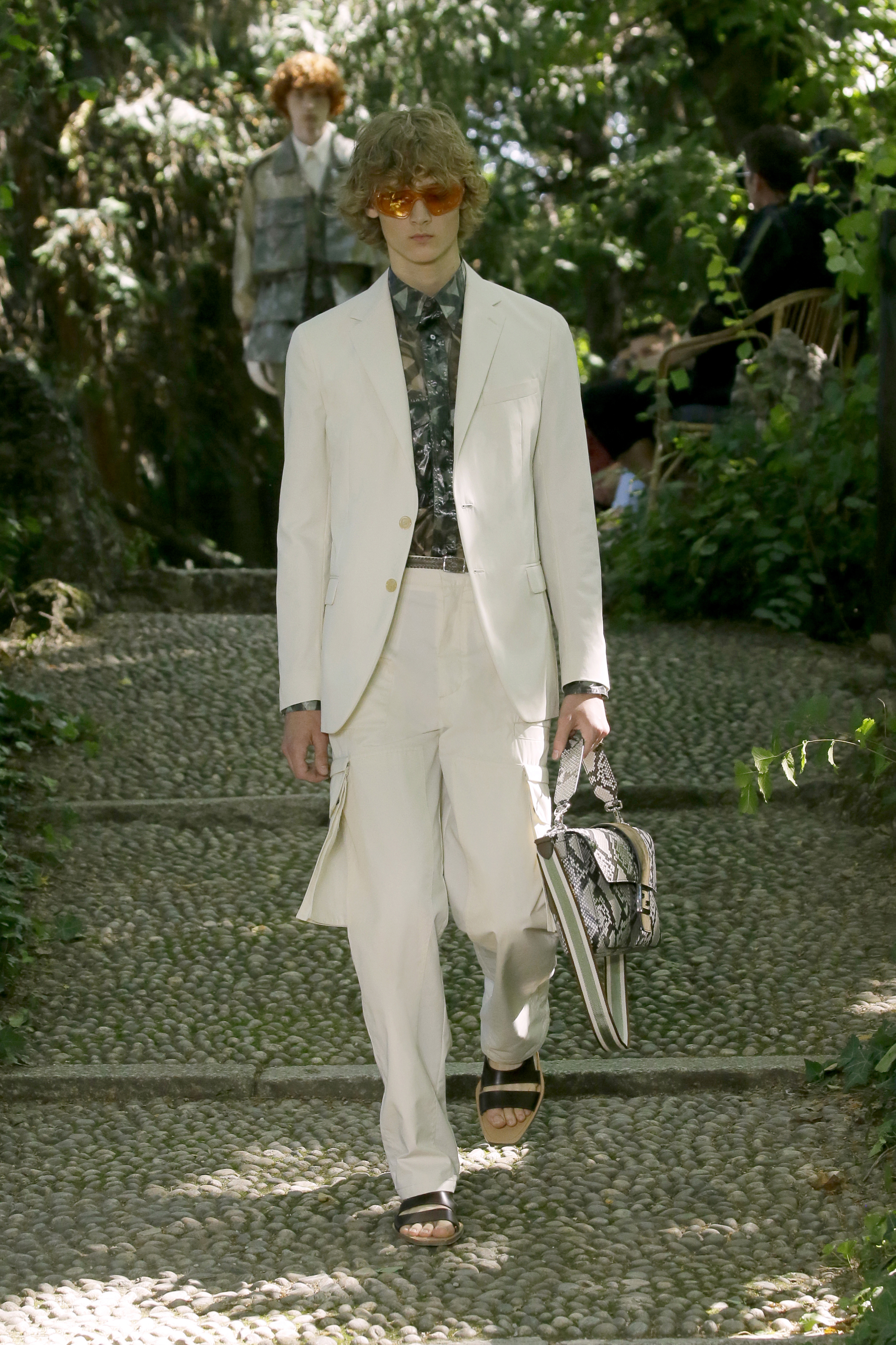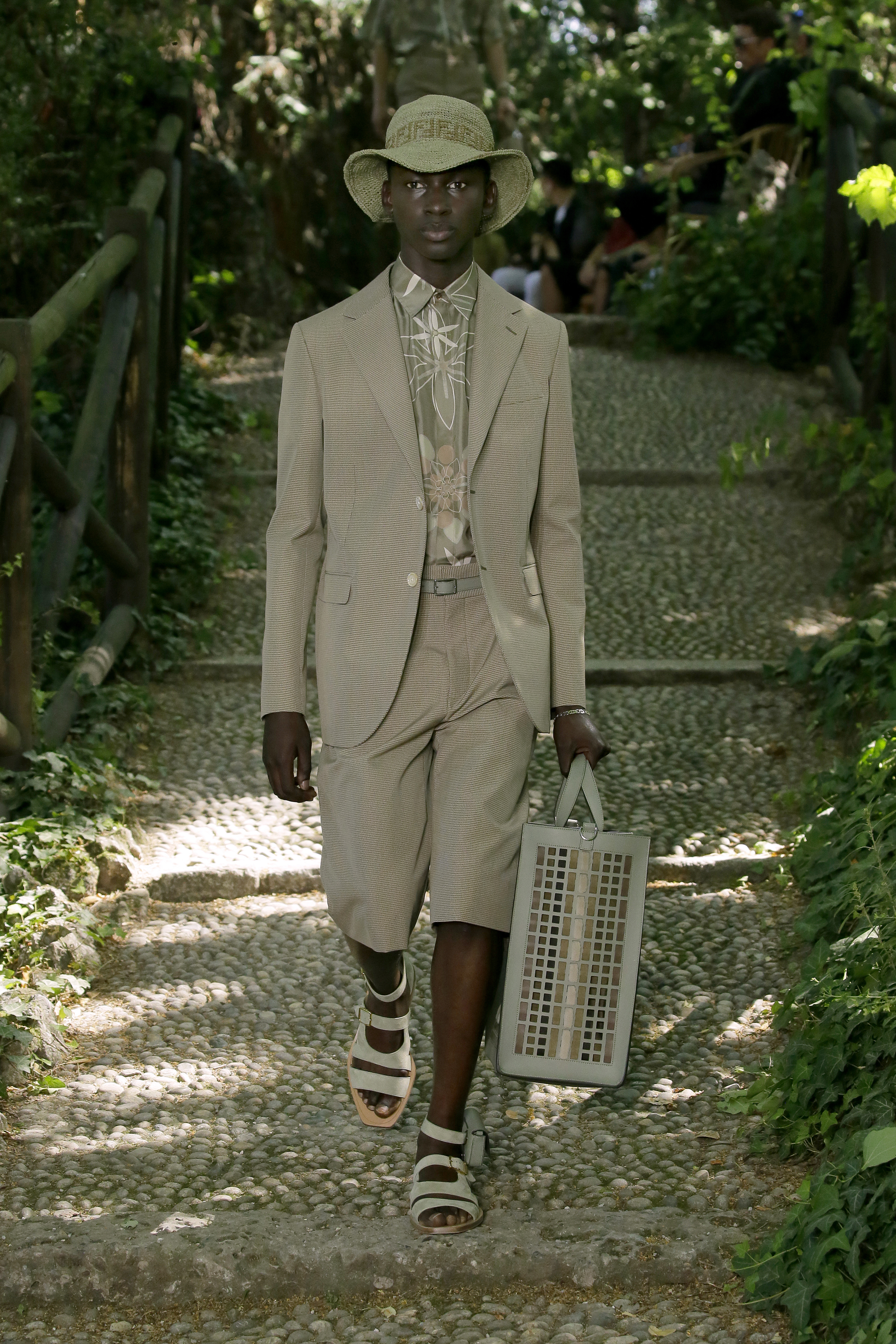 Reconnecting man with “the great outdoors”, models trudged down cobblestone stairs and along a gravel makeshift runway donned in sartorial workwear. Drawing on her favourite past time of gardening, menswear creative director Silvia Venturini presents an emphasis on functionality and utility. The DNA of the luxury fashion house is seen through a muted palette of green, beige and brown and quintessential Italian tailoring, albeit with a modern twist.