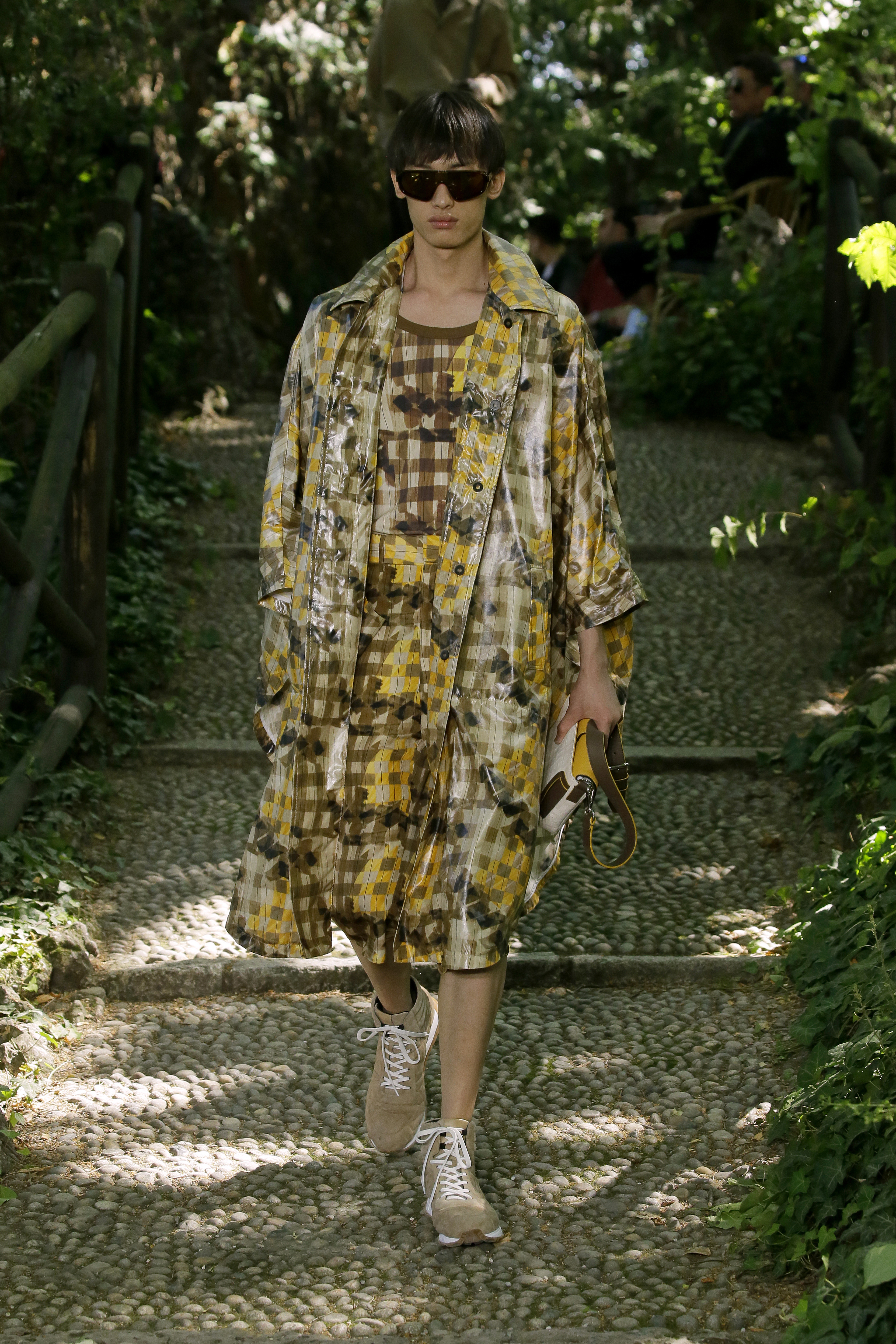Male iterations of the famed ‘Baguette’ were also on show in classic leather and monogram styles, while quirky watering cans and picnic basket-style bags revisited the recurring theme of nature. Looks were finished off with a range of combat boots, sandals and loafers as well as basic bucket hats.