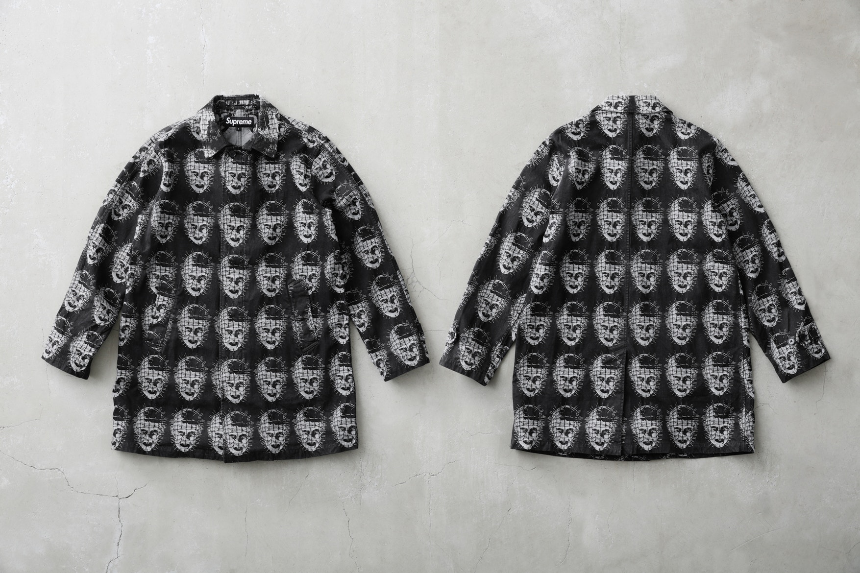 The original Hellraiser instalment was written by Clive Barker in 1987 and is centred around a mysterious box of puzzles, that when toyed with, releases creatures called the Cenobites, lead by the infamous Pinhead. For the Supreme collaboration, he appears on pieces such as raincoats, soccer jerseys, shorts, hoodies, knit sweats, shirts and even a skateboard.