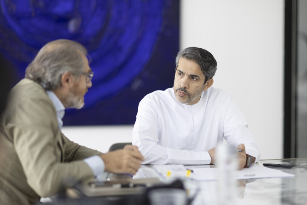 This is where Mattar entered the picture, almost immediately. “And they found immediately the connection with Mattar because he’s the artist behind the Museum of the Future’s calligraphy and he created these amazing artworks.” Their first meeting took place at none other than the Museum of the Future, followed by a working session in Mattar’s studio, and encounters that set the tone for a fluid creative exchange. “He explained everything, and after, we had a meeting in his own studio. We started immediately to talk about the sketches, the products, the piece of art.”