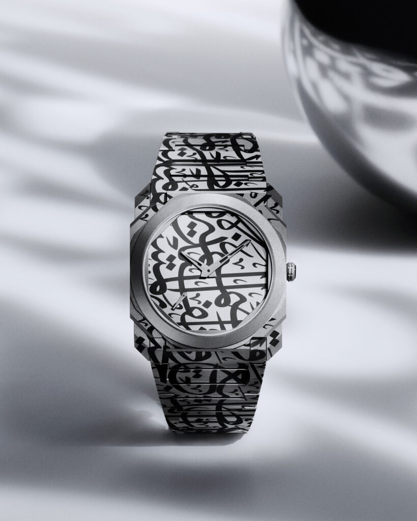 Dubai Watch Week was the stage for the unveiling of the Octo, but it was also the place where the initial spark happened. “During the last Dubai Watch Week, I met Mattar for the first time,” Fabrizio recalls. The idea, however, had been gestating earlier. “During my previous trip in Dubai, someone started to talk about calligraphy, and I already had this project in mind, and I said, wow, why are they talking about calligraphy now with me? Maybe it’s because it’s something that is in the air.”