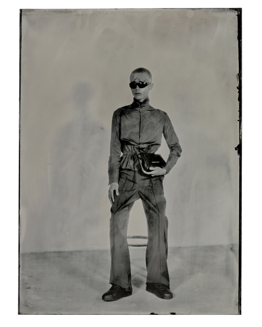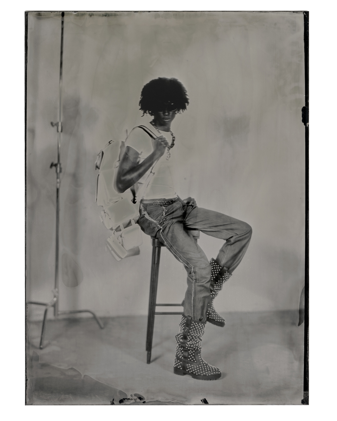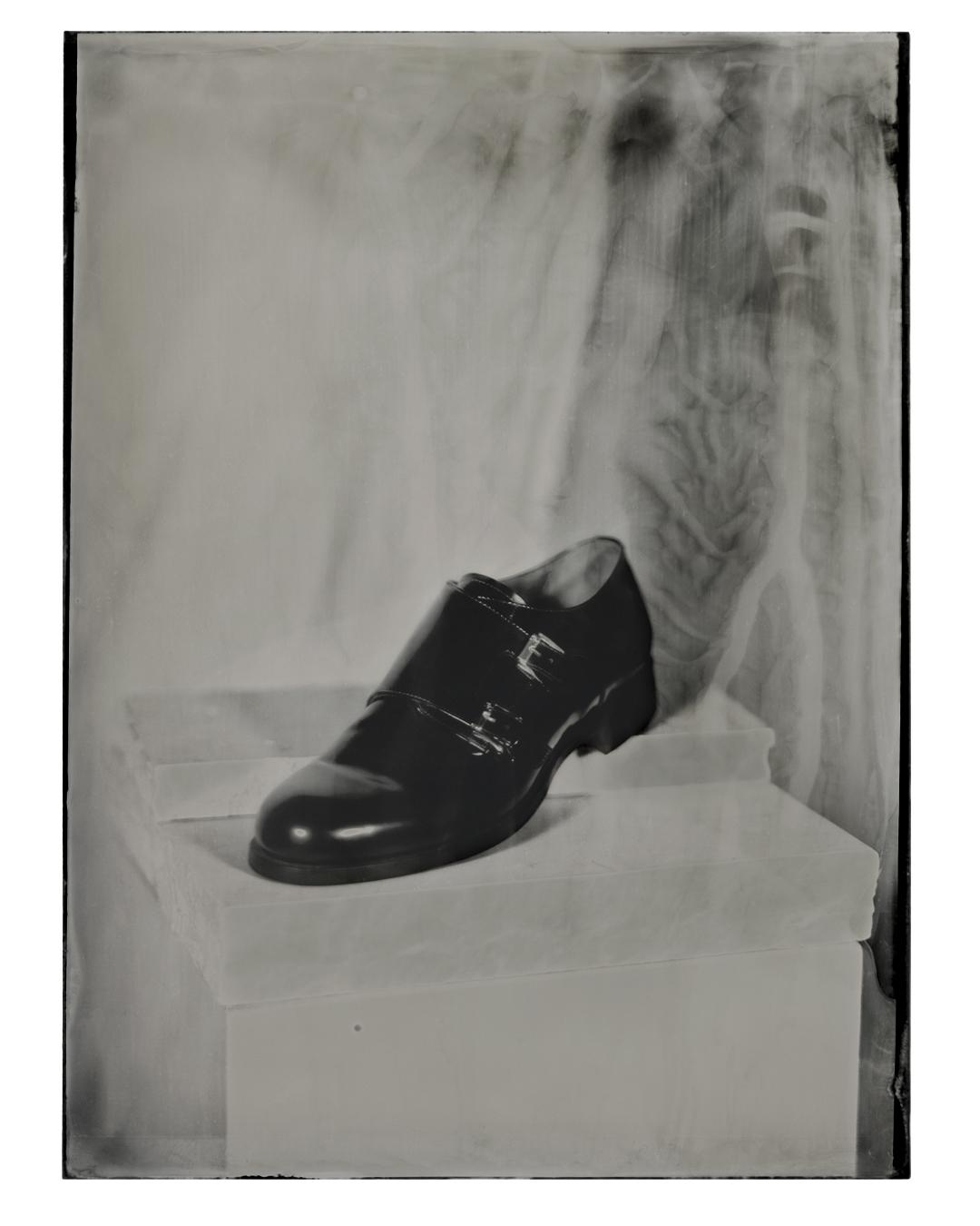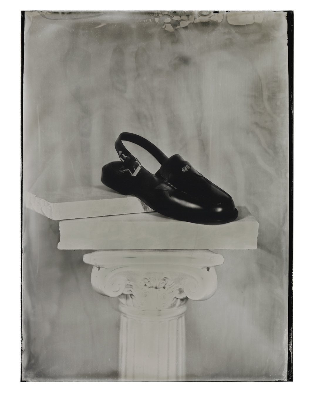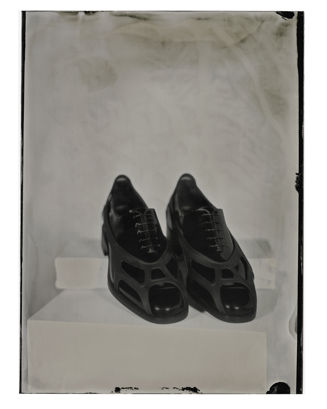 An Angel sculpture from Christian Louboutin’s own collection, featured in the first shoot with Jaden, stood as a symbol of their working relationship. A photo installation showed his designs captured using early photographic techniques, developed by hand under cloth with silver and chemical solutions. Some appeared as red-illuminated negatives, tying the process back to the house’s defining colour.