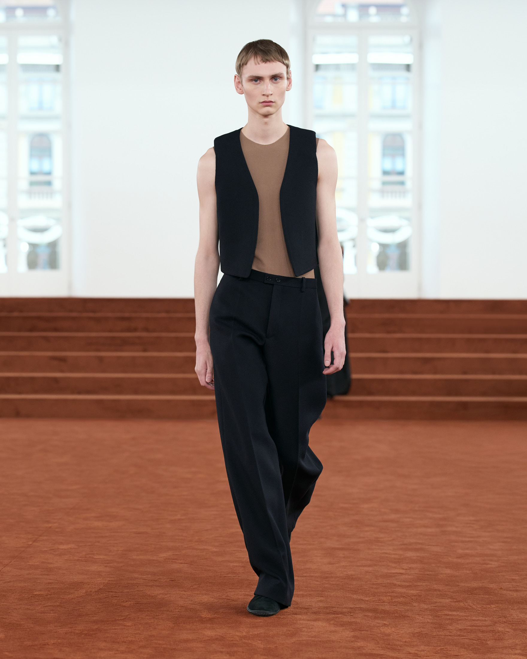 Bellotti’s personal history informed the approach: growing up with a father who worked as an upholsterer gave him an intimate understanding of textiles and structure. He translated this into clothing that responds to movement and interaction, much like objects in a living space. Familiar codes of the brand were subtly reinterpreted. Restrained tailoring met fluidity and softness, creating a balance between precision and ease.