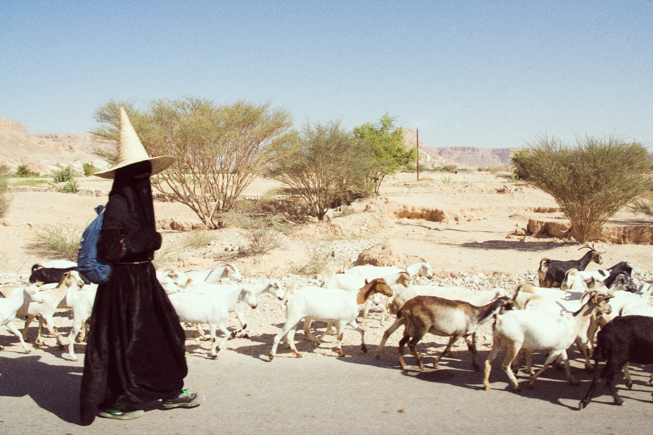 My journey began in Al Ghurfah, a town nestled in the Hadhramaut Valley, about nine kilometres from the capital, Seiyun. There, I encountered a 31-year-old woman who preferred to be referred to as Umm Saleh. As she tended her flock in the valley, she was dressed entirely in black from head to toe; she wore a heavy black velvet abaya, black gloves, and a black face veil, along with sunglasses, and carried a smartphone. It seemed that the goats knew her instinctively, their behaviour mirroring that of a child recognising the mother by her voice and scent. She happily agreed to talk to us, suggesting we have our conversation at her home rather than in the valley, so as not to distract her from her flock. And so, we went to her home in the afternoon.