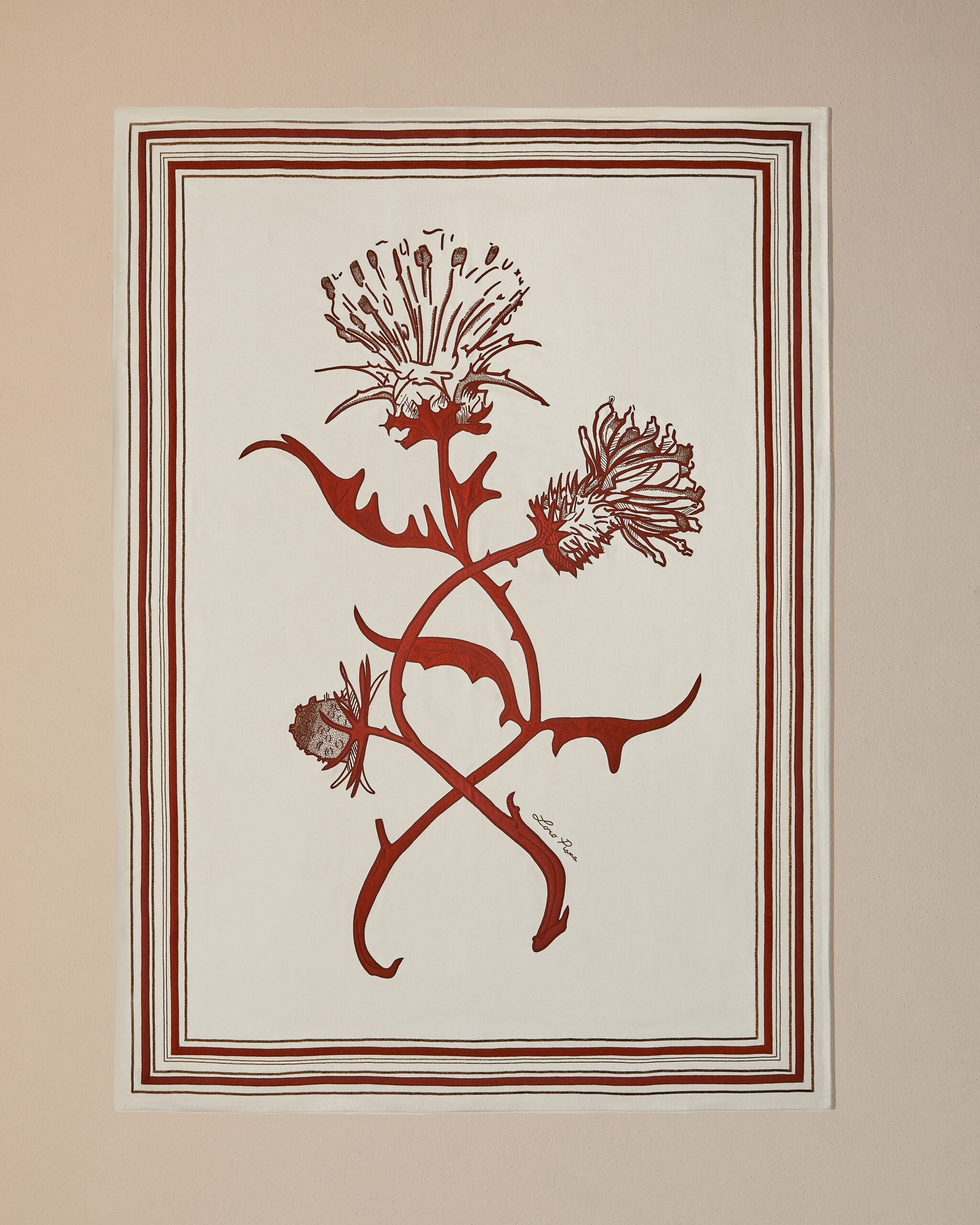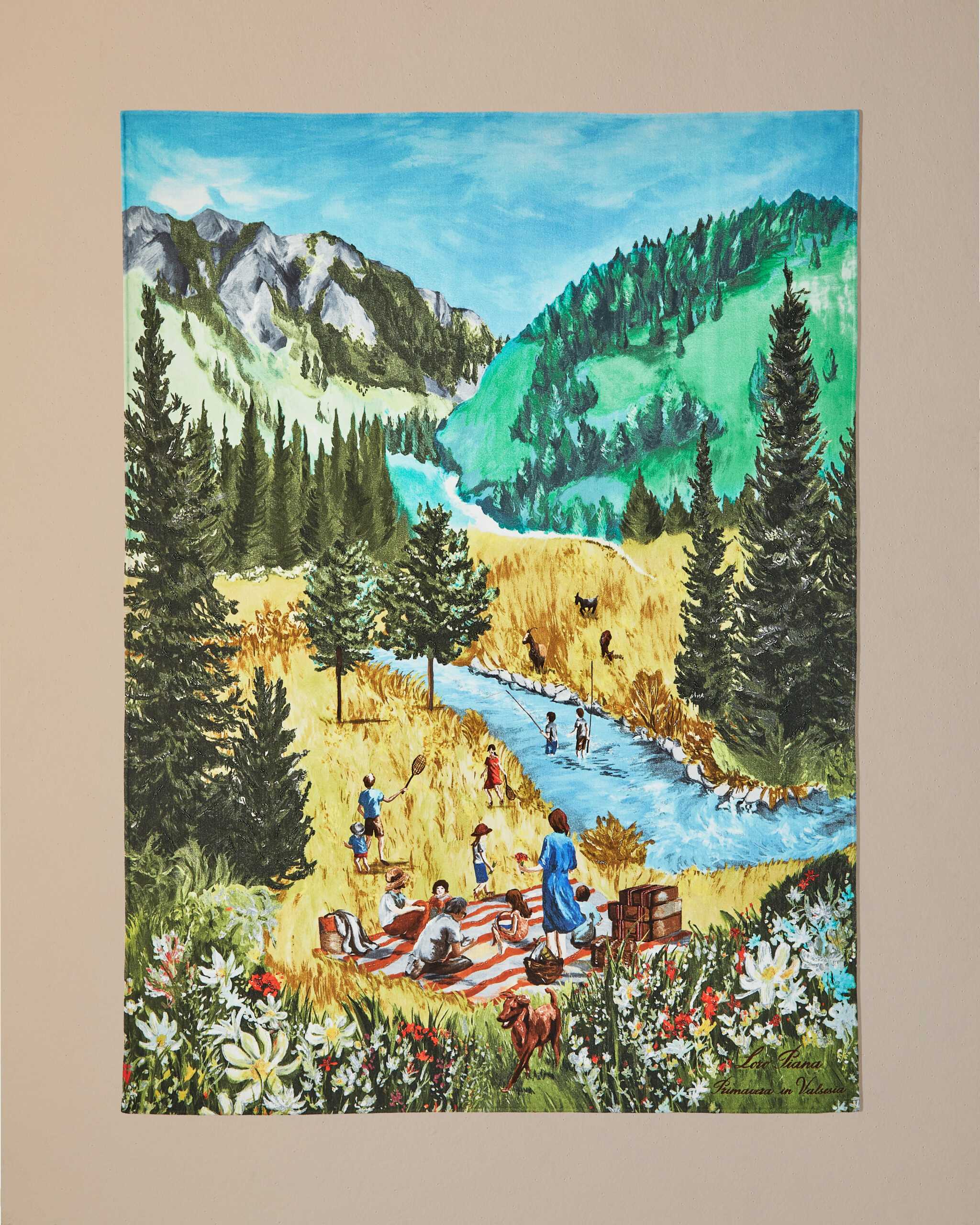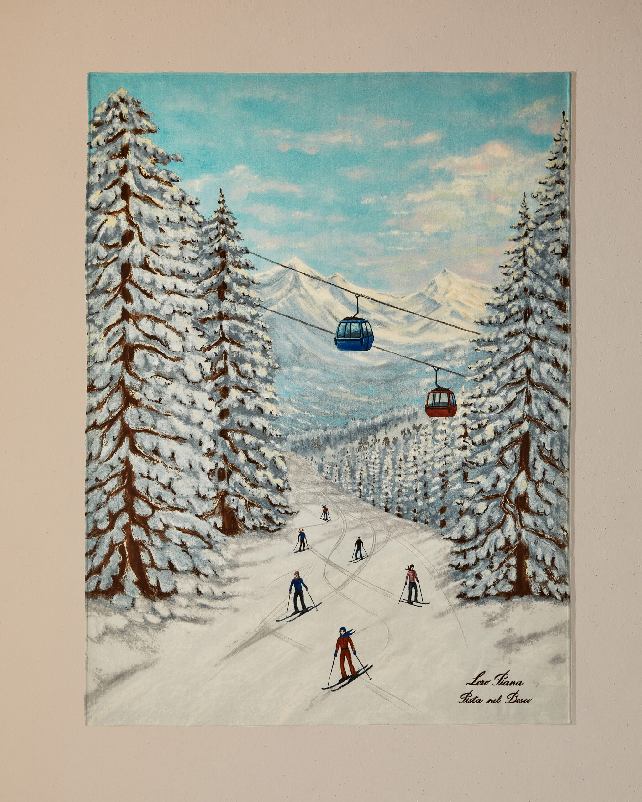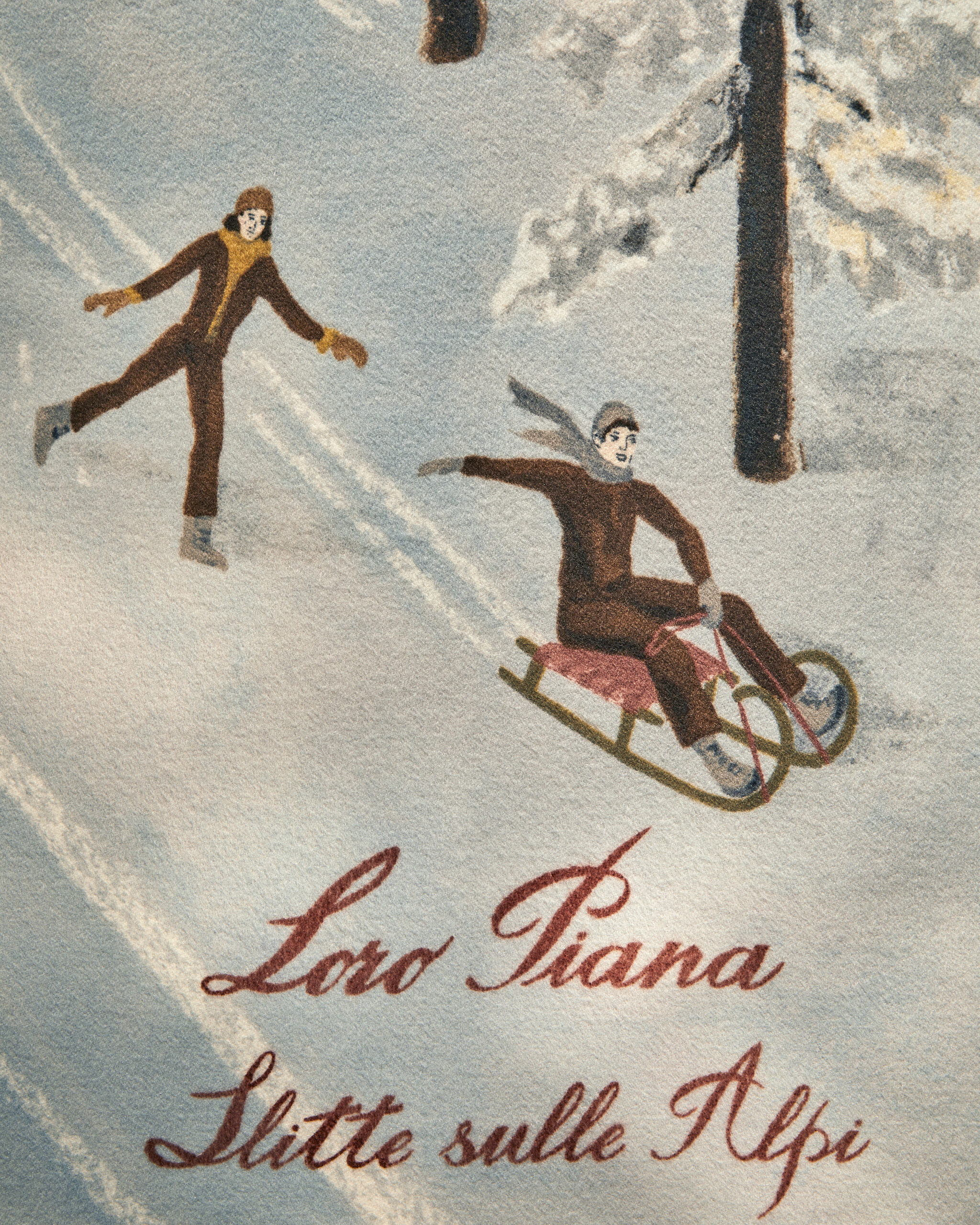The result is an exercise in decoration that quietly refuses to be about decoration. Historic symbols and graphic elements drawn from the house archives reappear across the selection, motifs translated into contemporary compositions, landscapes tied to the brand’s origins, botanical references alongside more abstract forms. Each piece is made exclusively to order, approached like couture. But the installation shifts focus, making it less about the object itself and more about understanding it. A reminder that for Loro Piana, everything starts with the raw material. Refinement is what follows.