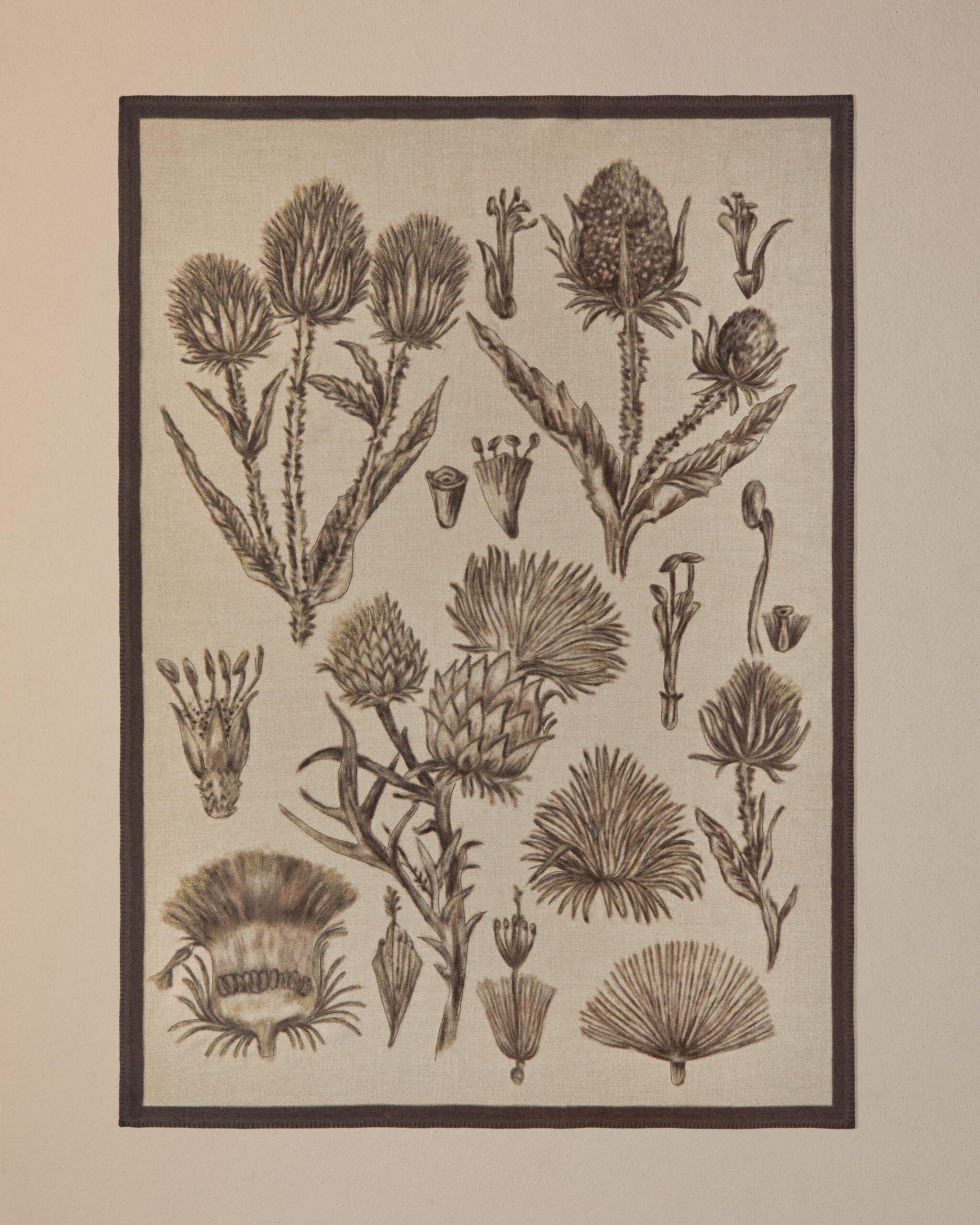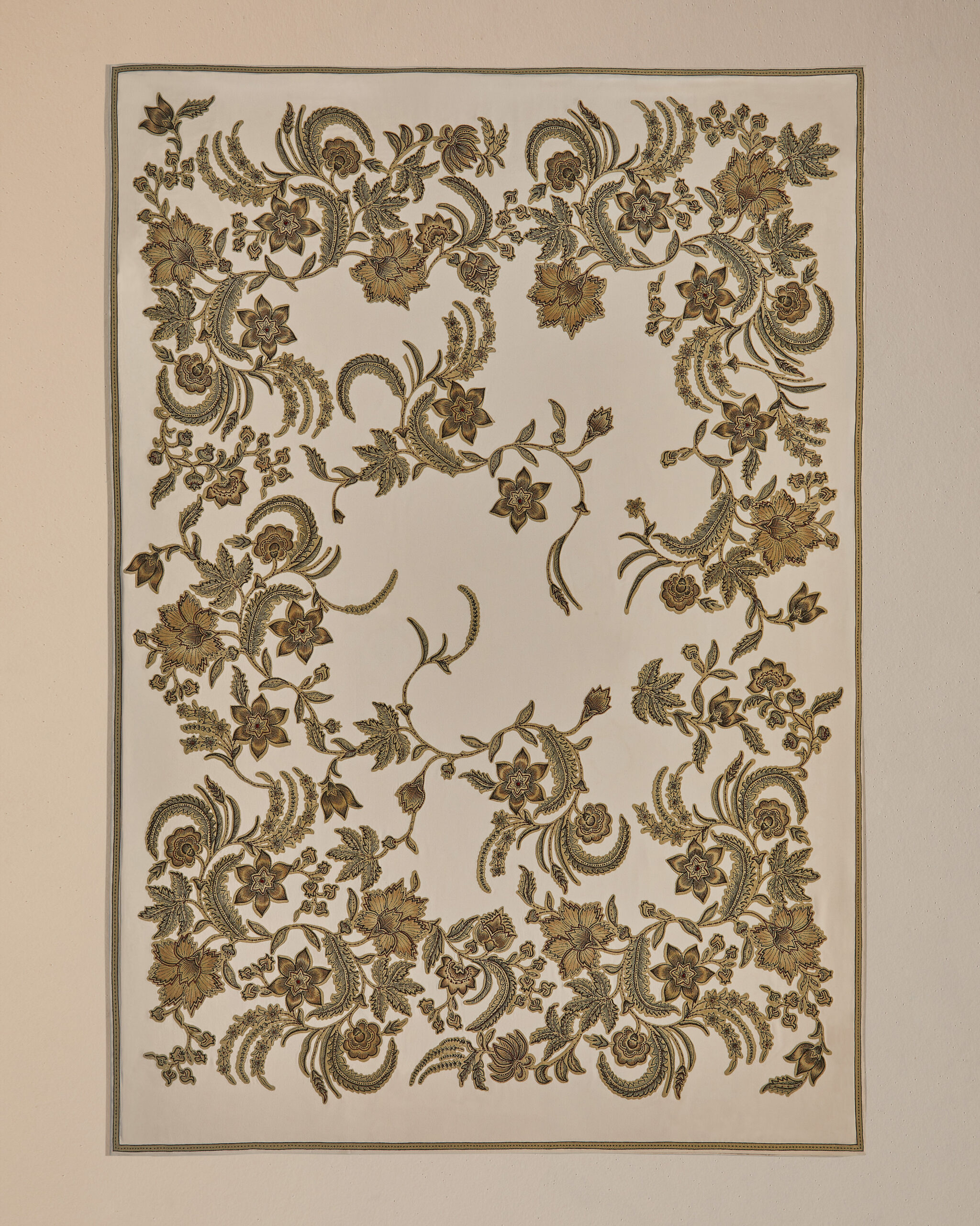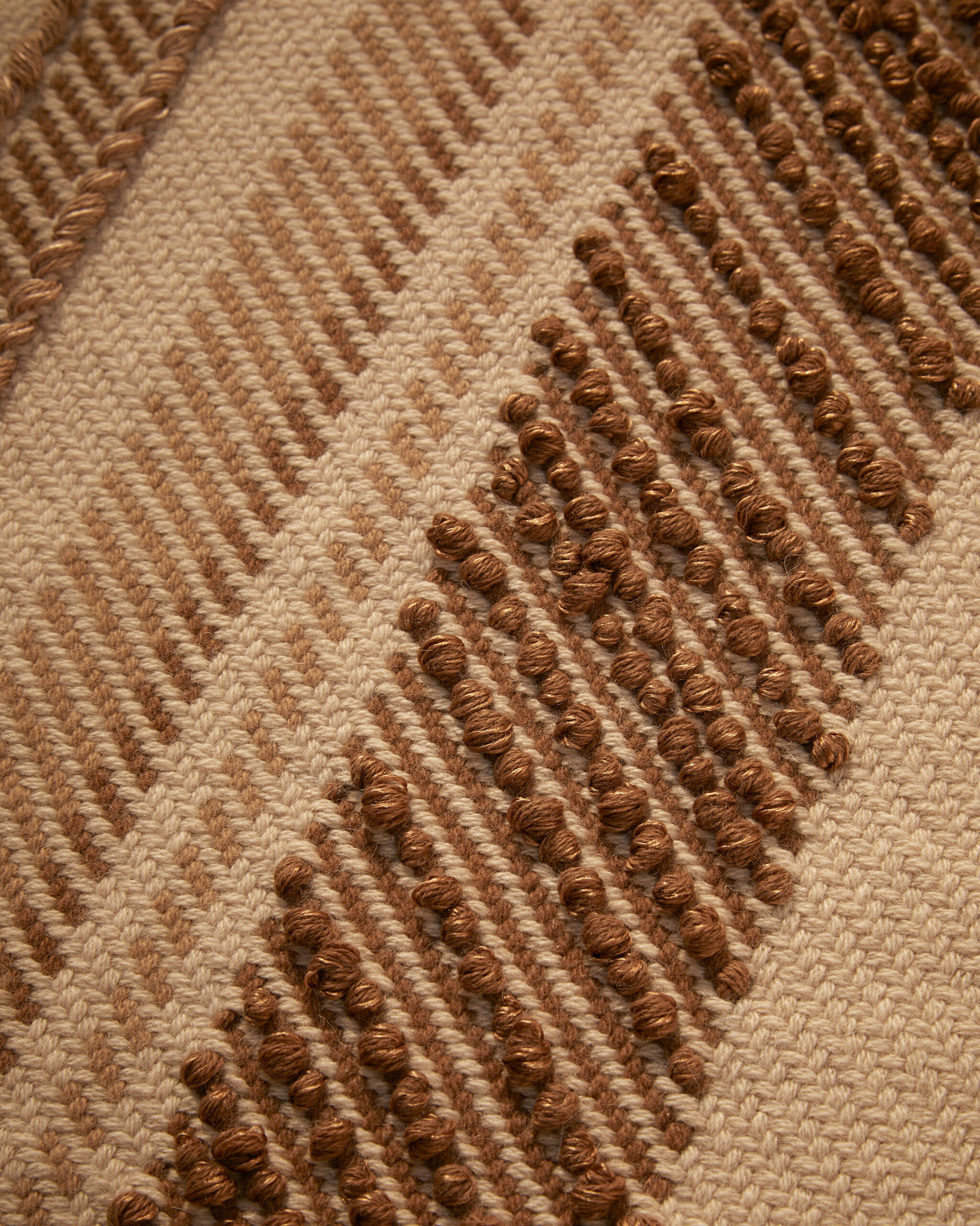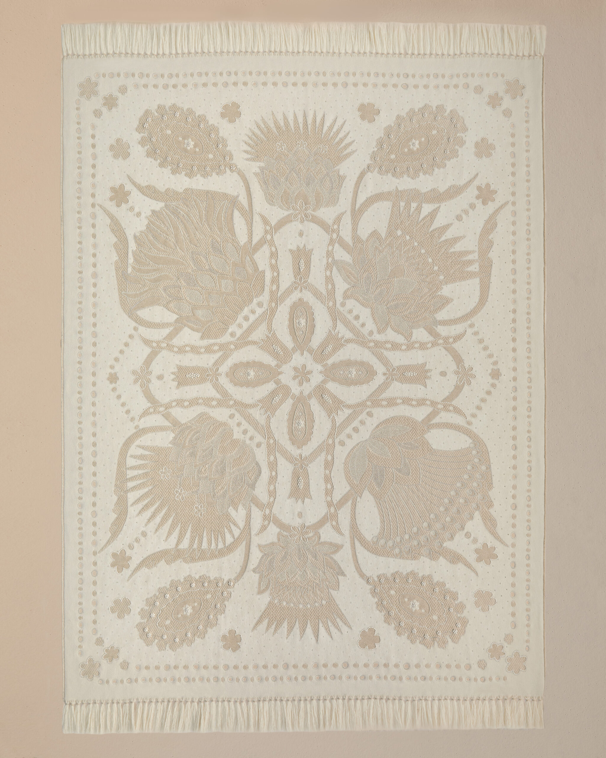 The result is an exercise in decoration that quietly refuses to be about decoration. Historic symbols and graphic elements drawn from the house archives reappear across the selection, motifs translated into contemporary compositions, landscapes tied to the brand’s origins, botanical references alongside more abstract forms. Each piece is made exclusively to order, approached like couture. But the installation shifts focus, making it less about the object itself and more about understanding it. A reminder that for Loro Piana, everything starts with the raw material. Refinement is what follows.