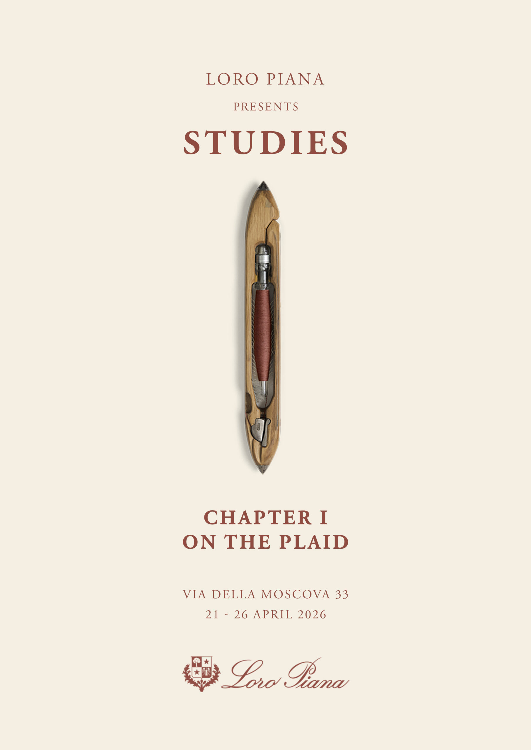 Studies, Chapter I: On the Plaid is open to the public at Cortile della Seta, Via della Moscova 33, Milan, from April 21st to 26th, 10:00 AM to 8:00 PM.