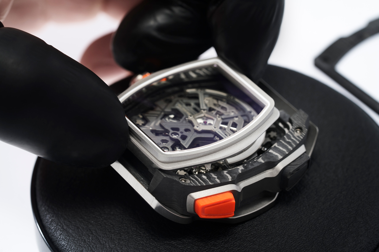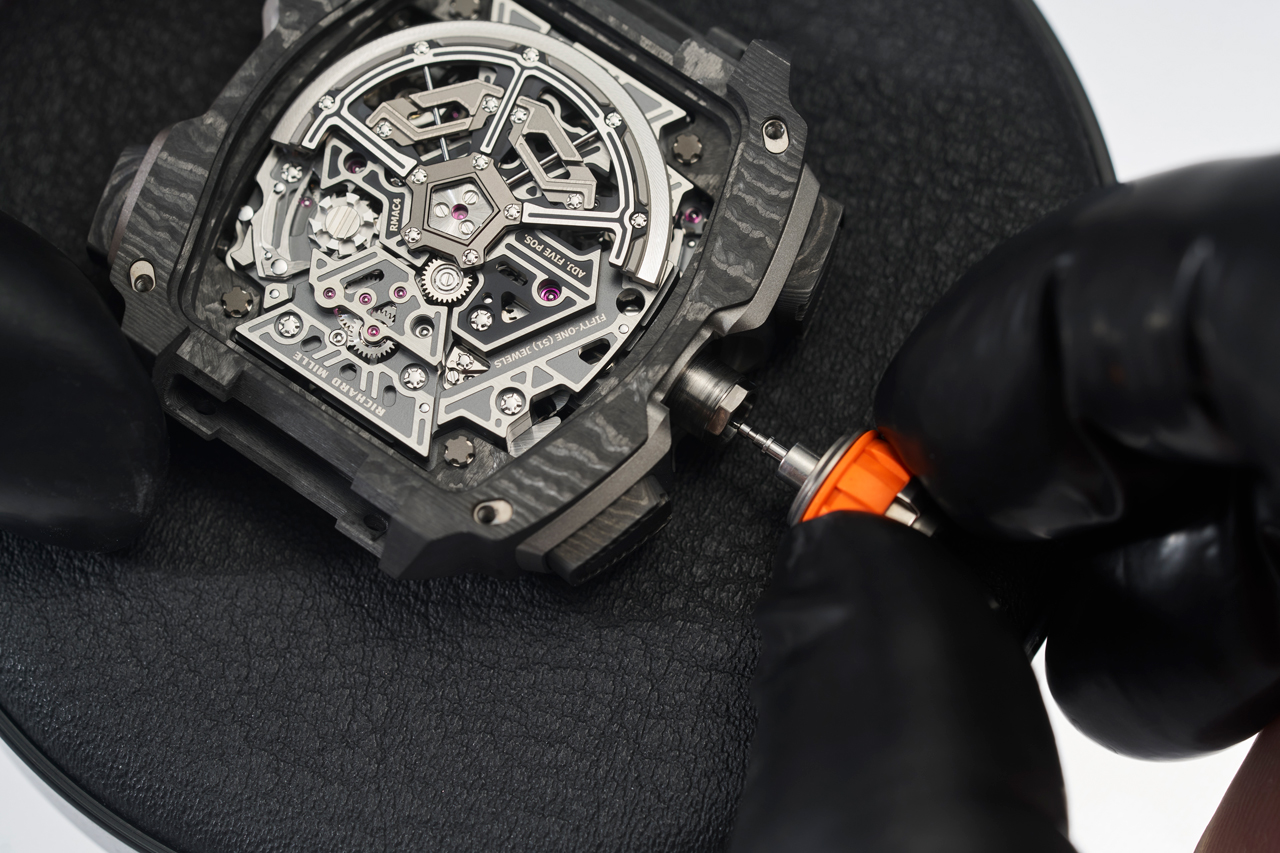 Design-wise, it’s undoubtedly a masterpiece of engineering. The indented double bezel draws direct inspiration from the W1’s compact, muscular form and its gull-wing doors, while the case itself, made from Richard Mille’s signature Carbon TPT®, exudes strength and lightness. Nine months of development—and eight prototype designs—went into shaping the bezel alone. This is the type of relentless pursuit of excellence that defines both Richard Mille and McLaren.