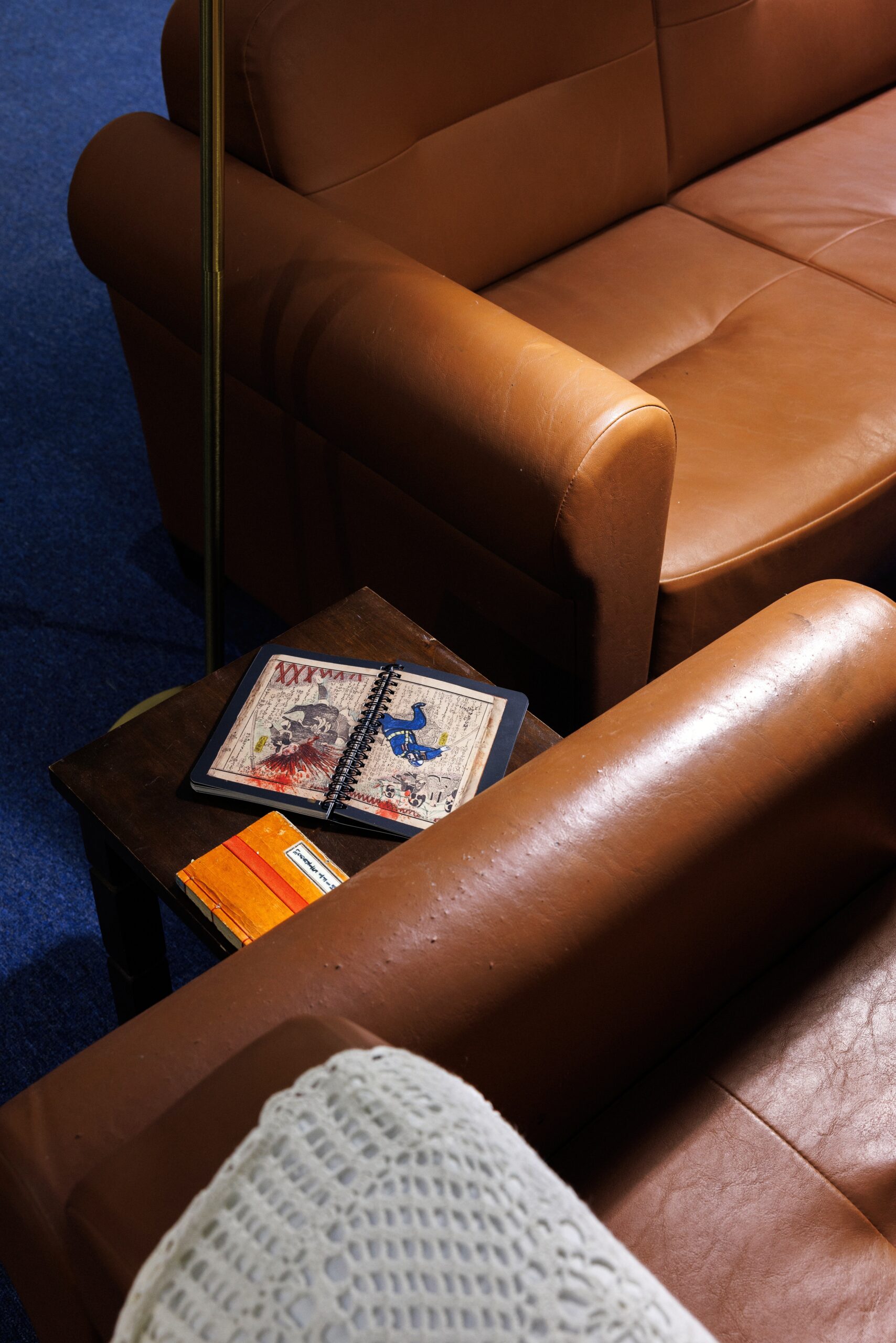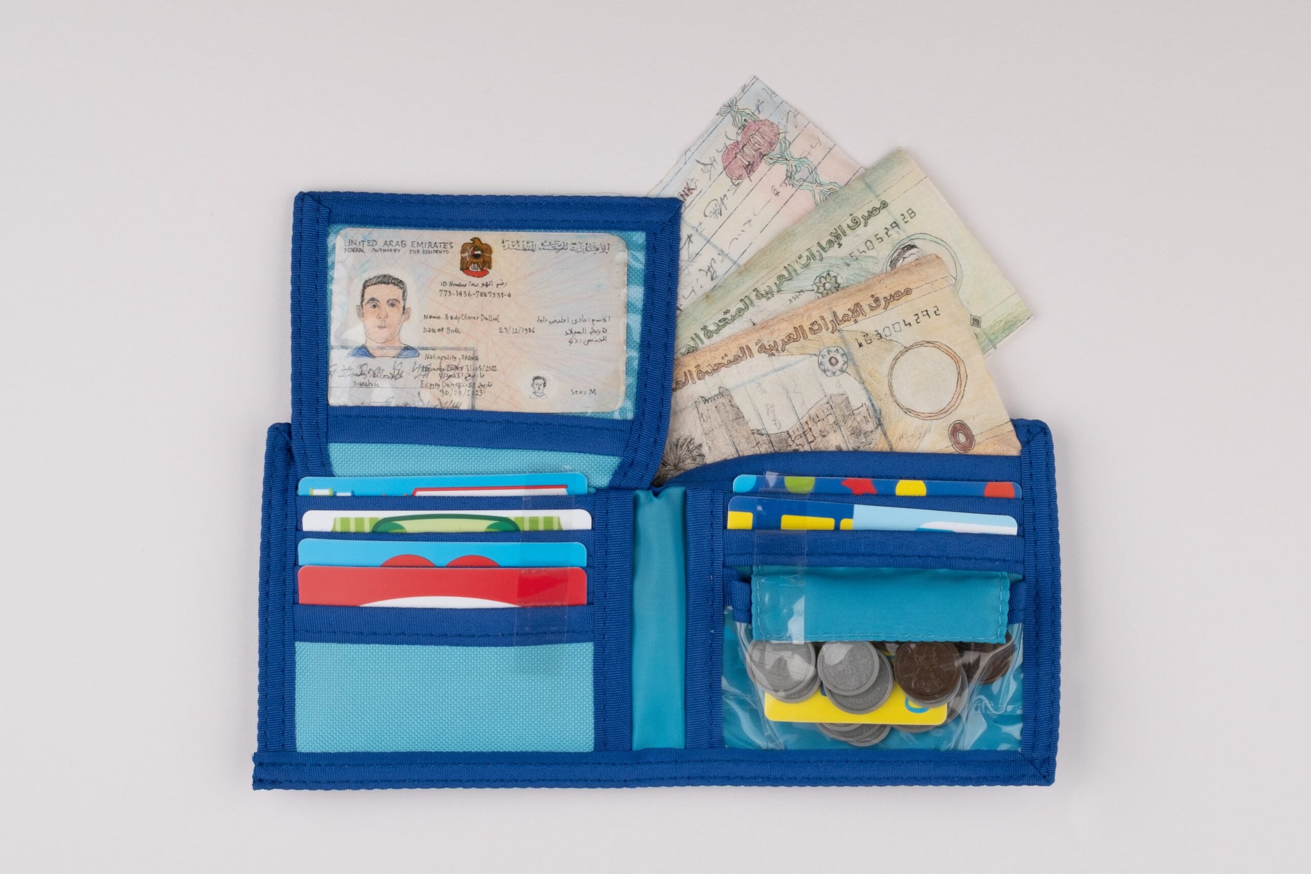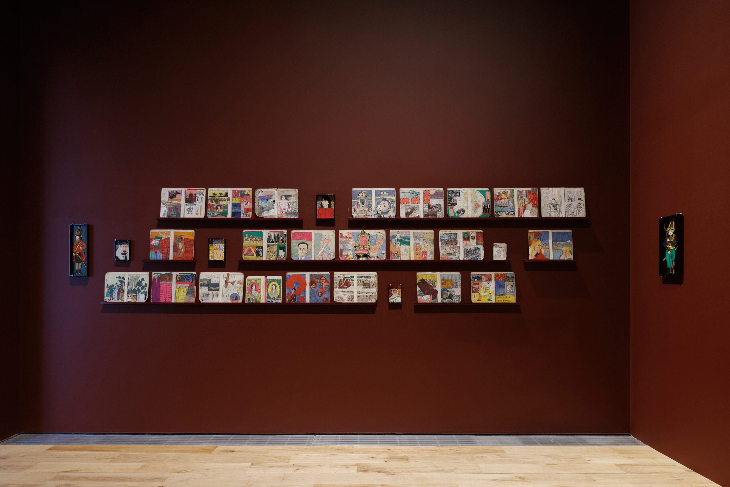 The simple home that Dalloul has created is somewhat based on his own, showcasing personal mementos, intriguing artworks and facsimiles of collage-like scrapbooks he has previously made. In one exhibit, he presents a work, entitled Eating Life (2024) where small replica teeth show scenes and objects of daily life. According to Dalloul, “black ink and patience” is what it takes to make them. In another ink-on-paper work, The War Within (2000), he depicts a grey-toned battle scene. “As you can see, it’s not an ideal world,” he comments on his creations. “It’s also made of violence, war, but also imagination. I do not want to make a perfect place. I just want to create a place where I have my own place.” In addition, he says: “I’m trying to make sense of it all: migration, identity and contemporary history.”