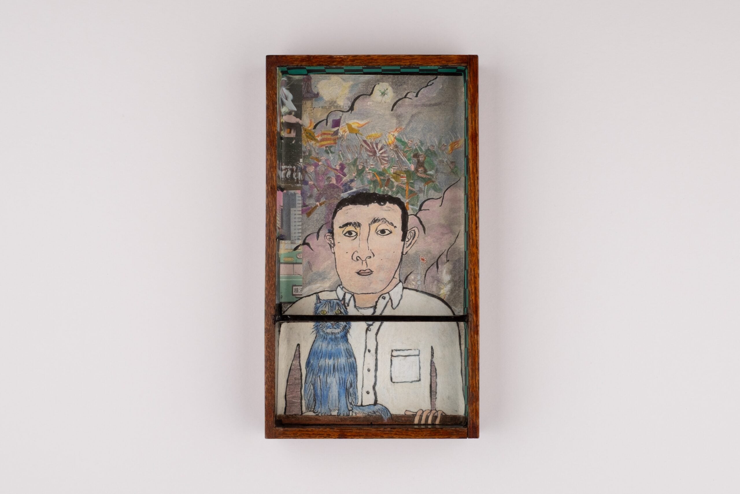 The exhibition is named after a small yet central displayed artwork, where Dalloul depicts himself with a blue cat (an animal which he is allergic to) during his time in Japan. While discussing his self-portrait, Dalloul mentions The Blue Light, a book by the Palestinian author Hussein Barghouthi, whose story resonated with the artist. “He was talking about his migration to the US and how he was roaming at night, feeling estranged and alienated, and remembering scenes from his past life and childhood. Our stories are completely different but there is this idea of remembering scenes from elsewhere when you are somewhere and how some things make sense or don’t make sense at all. So, I did it my way,” he says of the painting, featuring other components such as scenes of Tokyo, geometrical patterns and battle images.