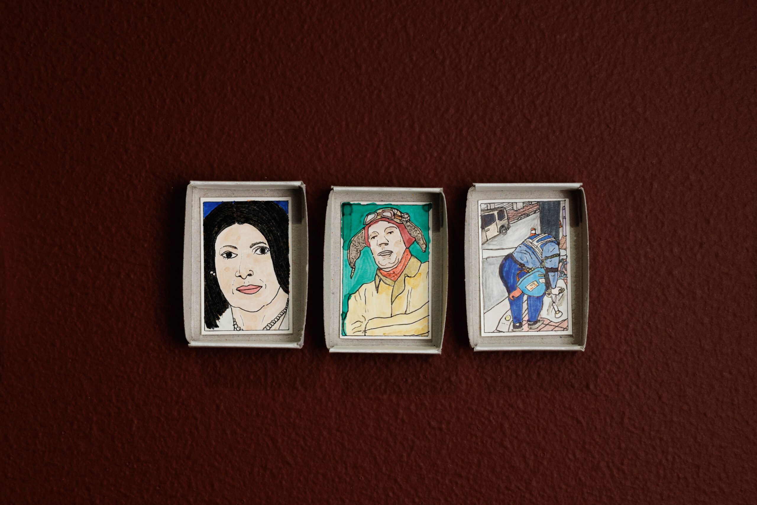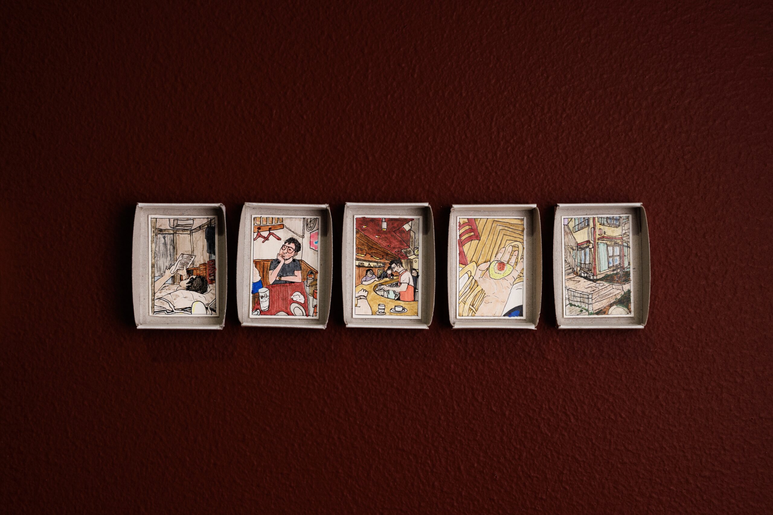 A key exhibit that is being showcased is a series of tiny drawings placed inside matchboxes, lined in an organised manner on two walls. These matchboxes, some of which can take up to two hours to complete, are something of a visual diary for the artist. “You will see across the exhibition how I really like using things from daily life. I wanted something that was familiar and everybody can use and relate to,” he explains about the chosen medium for the series.