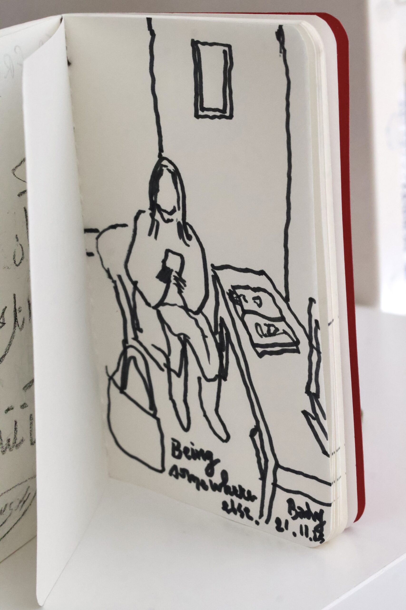 As we reach the end of our conversation, we take a seat in the ‘bedroom’ of his home, where I continue to absorb the quiet world he has expansively imagined and carefully created. I ask him if he would like to contribute to a small notebook I have been carrying around since last summer, where I have been asking predominantly regional artists to jot down their personal messages to the world – be it about life, art, creativity or anything that comes to mind. Dalloul takes a black marker and quietly draws an image of his exhibition, accompanied by three simple, metaphysical words that adequately sum up his practice: “Being somewhere else.”