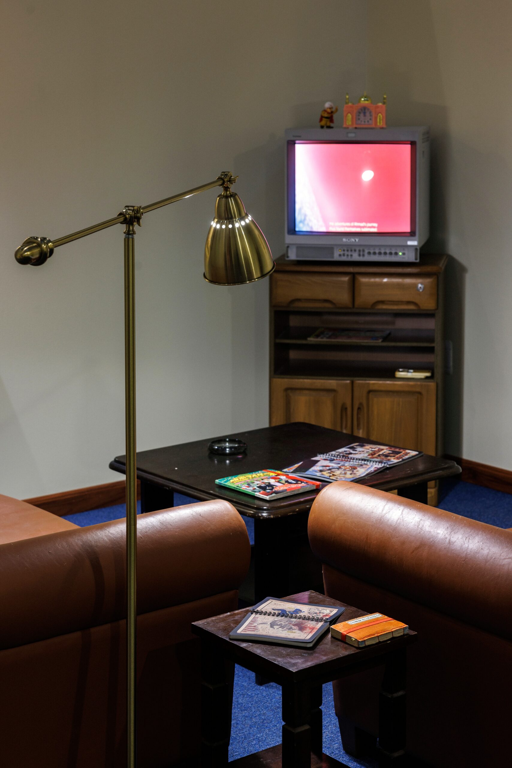 An old television set shows a video, Ahmad the Japanese (2021), which Dalloul created during his Kyoto residency. Through it, he delves into the lives and experiences of Syrian and Arab immigrants (both men and women) in Japan, embodied through the archetypical character of Ahmad Al-Yabani. The work is also partially inspired by a poem, entitled Ahmad Al Zaatar, written by the late Palestinian poet Mahmoud Darwish, reflecting on the theme of migration. “It’s about someone who could not be fulfilled in life. He was born in a refugee camp and has no perspective. More than 40 years after it was written, the situation hasn’t changed much. People are still born in the Levant without a perspective, and the only perspective is migration,” explains Dalloul.