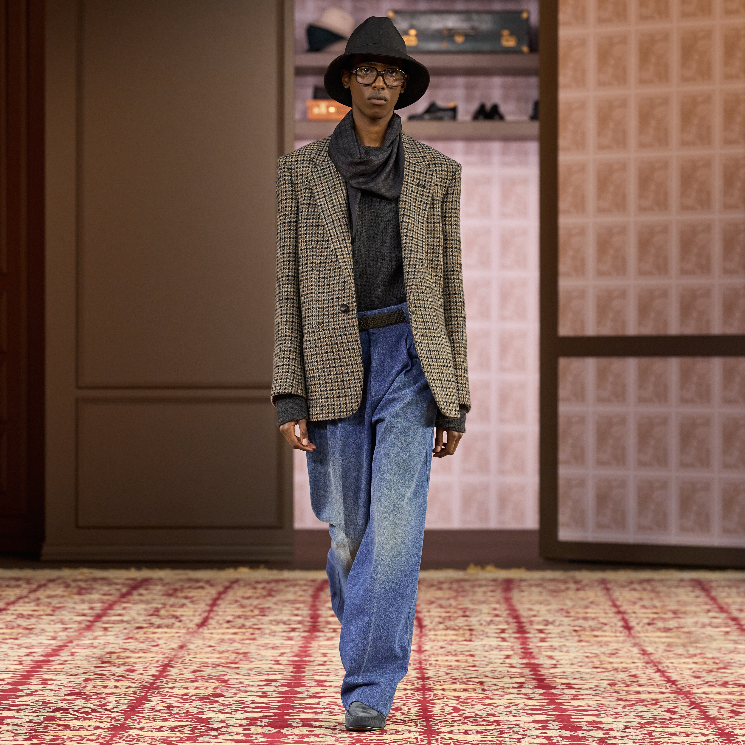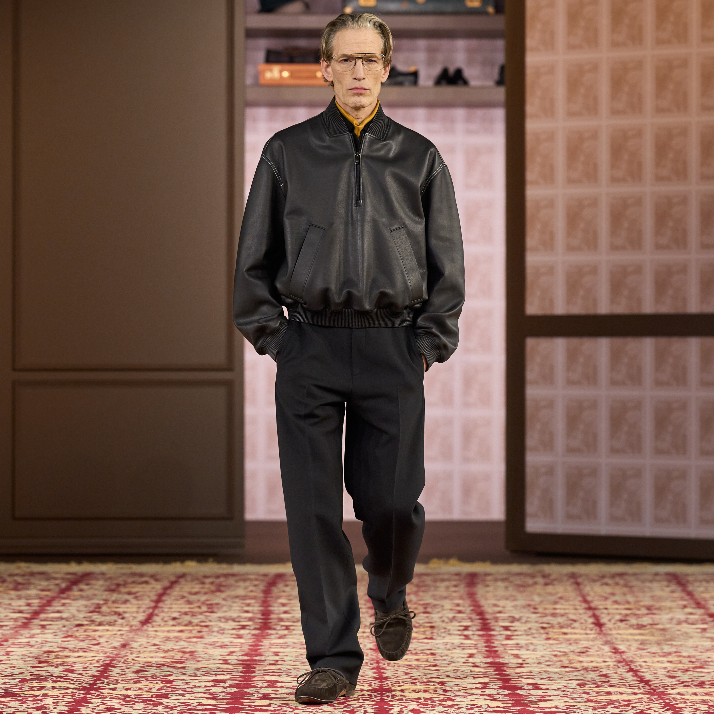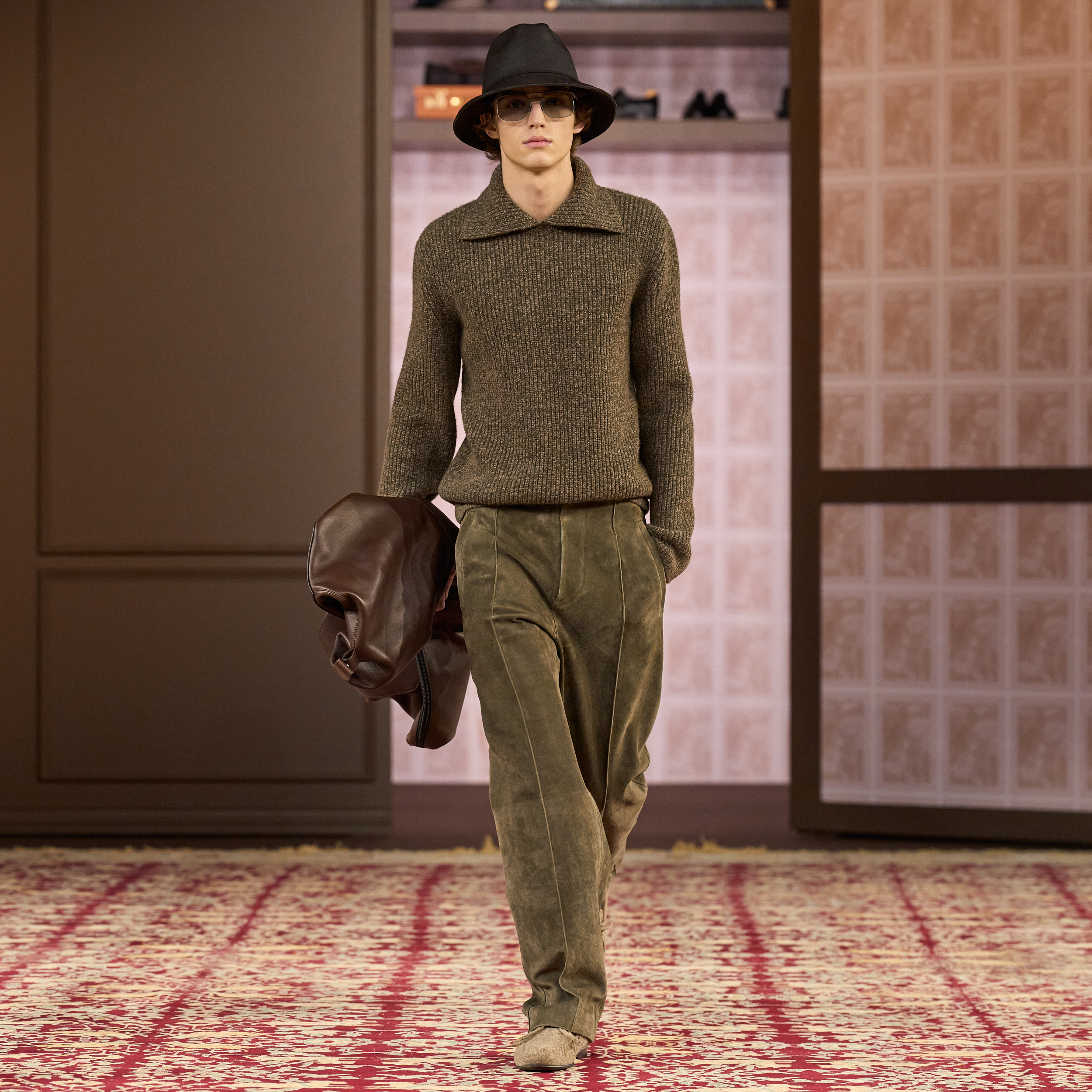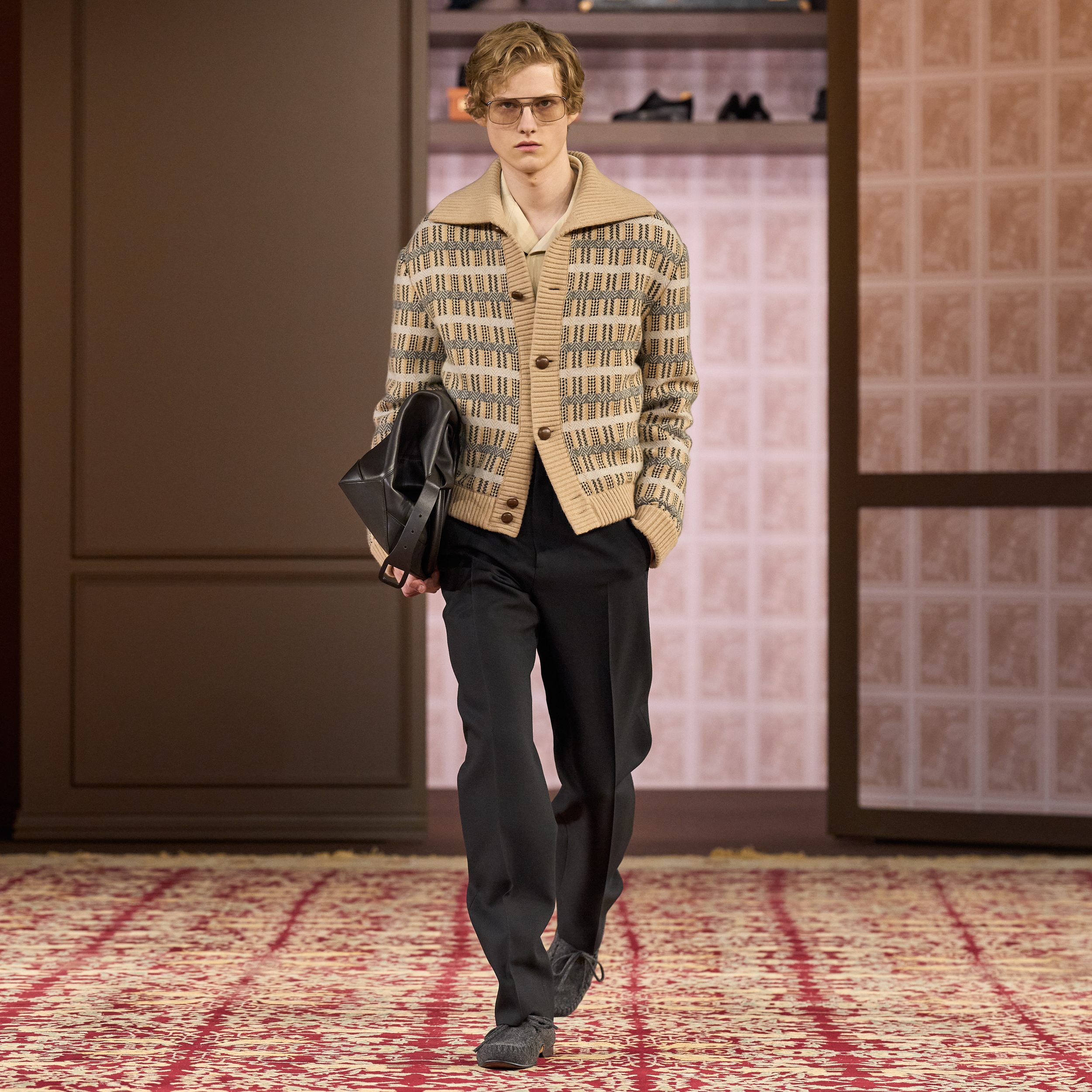 The runway did not fall short of accessories, spotlighting comfortable moccasins and slippers, stylish glasses and rain hats, and relaxed bags and briefcases