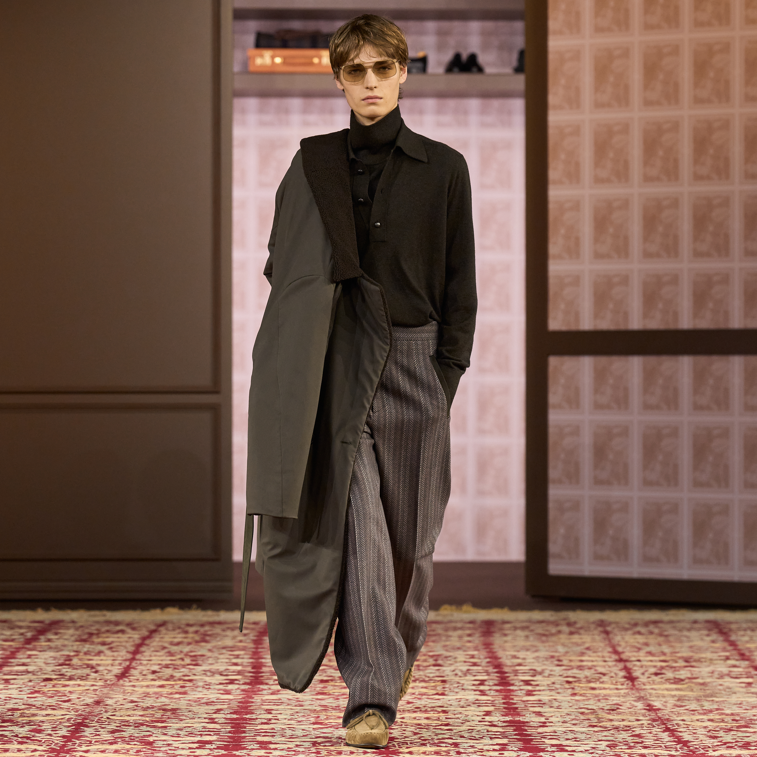 Making his runway debut is Chinese actor and singer William Chan who’s been recently announced as Zegna Global Brand Ambassador. Chan walked the runway wearing a double-cashmere raglan-shoulder car coat, layered over a constructed double-breasted three-button blazer with peak lapels in wool mohair. The look was completed by a waffle-stitch polo in a wool-paper blend, single-pleated wool mohair trousers with leather pockets, and suede lace-bow moccasins featuring a flexible leather sole with an artisanal leather insert.