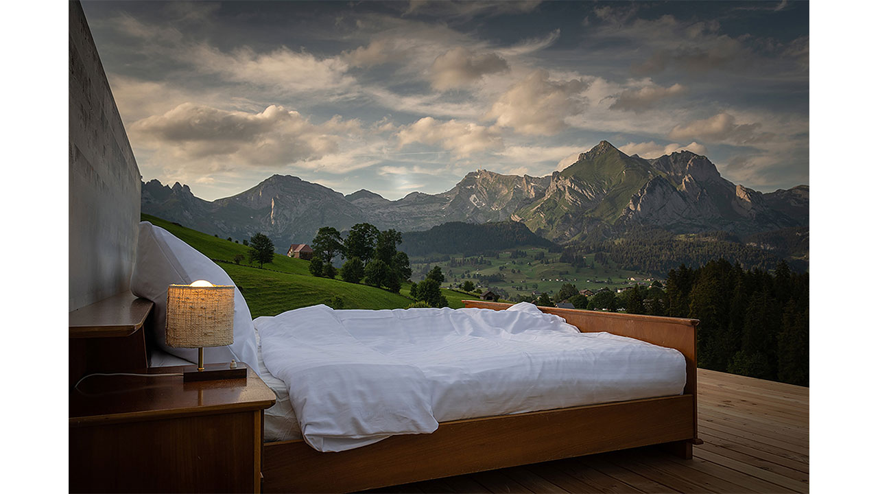 Situated in the Swiss Alps in the Toggenburg region sits the pop-up hotel, featuring nothing but a double bed and two nightstands sitting on a wooden platform. With no walls or ceilings, three open-air suites provide panoramic views of the Churfirsten mountain range, the Schwendi lakes, and the Rhine Valley, a one-night stay under the stars.